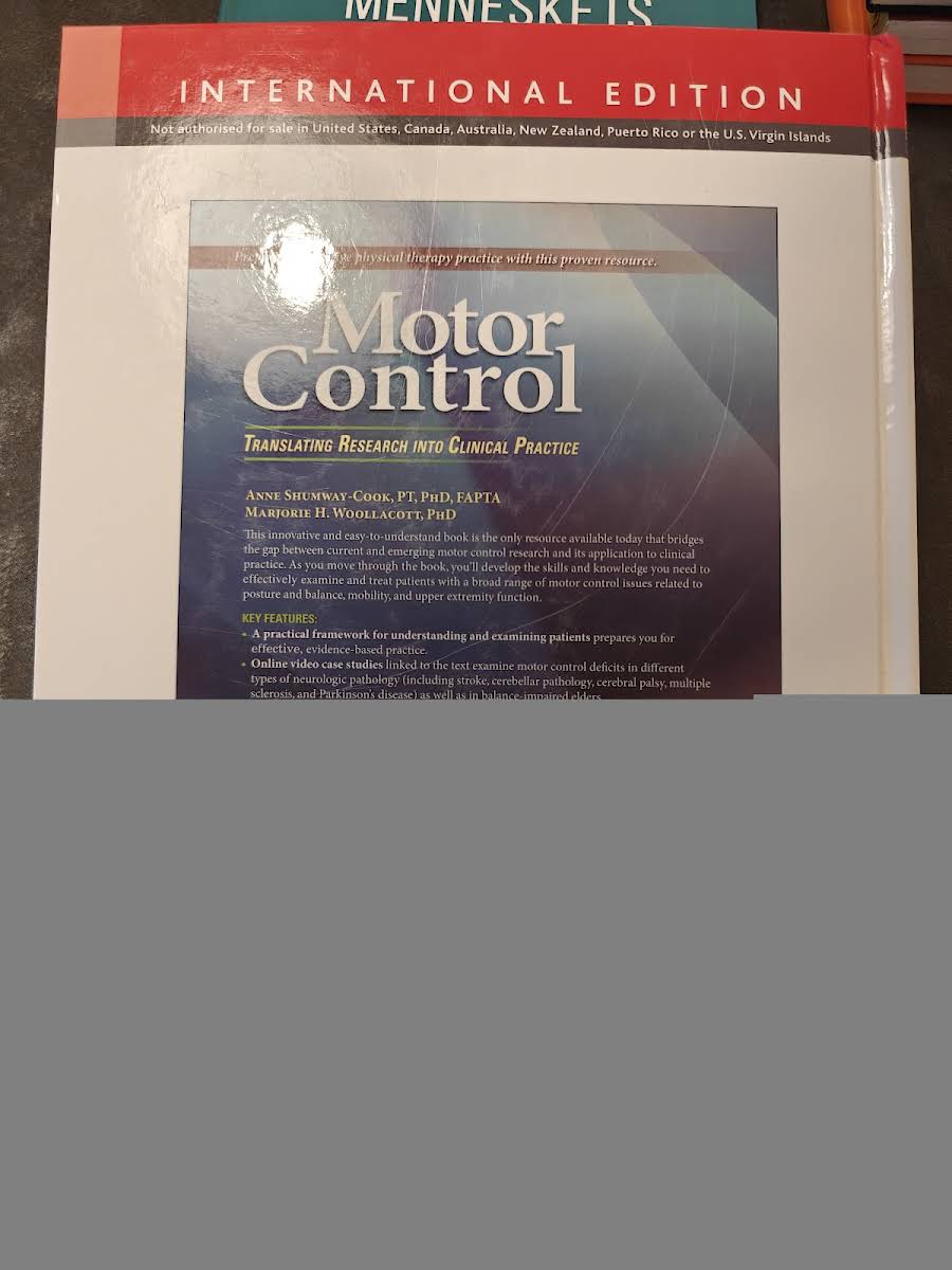 Motor Control: Translating Research into Clinical Practice (2016) af Anne Shumway-Cook og Marjorie H. Woollacott er det eneste omfattende værk, der bygger bro mellem aktuel motorisk kontrol‐forskning og dens direkte anvendelse i klinisk praksis. Udgivet af Lippincott Williams & Wilkins som hardcover på 640 sider, henvender bogen sig til alle, der ønsker at styrke deres kliniske beslutningsgrundlag med evidensbaserede metoder. Forfattet af to førende eksperter inden for neurologisk rehabilitering, guider bogen læseren gennem undersøgelse og behandling af patienter med udfordringer inden for postural kontrol, mobilitet og overekstremitetsfunktion. Fokus er på at omsætte teori til praksis med dokumenterede teknikker og redskaber. Hvert kapitel følger en ensartet struktur: først normal kontrolproces, dernæst aldersrelaterede ændringer, forskningsresultater vedrørende unormal funktion og til sidst kliniske anvendelser - herunder detaljerede metoder til undersøgelse og behandling af motorisk dyskontrol. Denne udgave er beriget med nyt pædagogisk materiale, supplerende instruktionsvideoer og separate kapitler, der belyser mobilitetsudvikling fra barndom til alderdom. Resultatet er et nutidigt referenceværk, der afspejler den hastige udvikling i feltet motorisk kontrol.