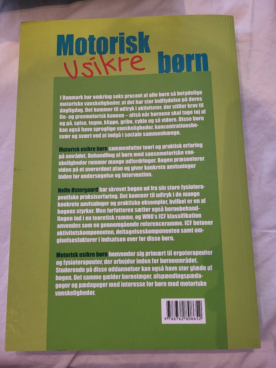 Motorisk usikre børn sætter fokus på de motoriske udfordringer, som påvirker en betydelig gruppe børn i Danmark. Fra barnets tidlige, medfødte motoriske evner til komplekse aktiviteter som at kravle, tegne, spise og cykle – udvikles de nødvendige færdigheder gennem erfaring og leg. For omkring seks procent af de danske børn bliver motoriske vanskeligheder en betydelig del af hverdagen, hvilket påvirker både fin- og grovmotorik. I denne fagligt nuancerede bog sammenfatter Helle Østergaard teoretiske perspektiver og praktisk erfaring med behandling af sansemotoriske vanskeligheder. Gennem klare anvisninger til undersøgelse og intervention henvender bogen sig primært til ergoterapeuter og fysioterapeuter, men den vil også være et værdifuldt redskab for pædagoger, børnelæger og studerende, der ønsker en dybere indsigt i barns motoriske udvikling og tilhørende udfordringer.