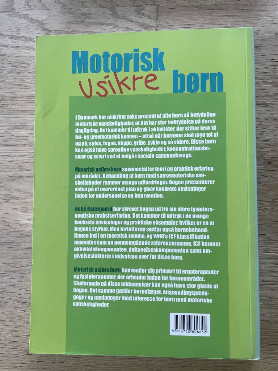 Motorisk usikre børn sætter fokus på de motoriske udfordringer, som påvirker en betydelig gruppe børn i Danmark. Fra barnets tidlige, medfødte motoriske evner til komplekse aktiviteter som at kravle, tegne, spise og cykle – udvikles de nødvendige færdigheder gennem erfaring og leg. For omkring seks procent af de danske børn bliver motoriske vanskeligheder en betydelig del af hverdagen, hvilket påvirker både fin- og grovmotorik. I denne fagligt nuancerede bog sammenfatter Helle Østergaard teoretiske perspektiver og praktisk erfaring med behandling af sansemotoriske vanskeligheder. Gennem klare anvisninger til undersøgelse og intervention henvender bogen sig primært til ergoterapeuter og fysioterapeuter, men den vil også være et værdifuldt redskab for pædagoger, børnelæger og studerende, der ønsker en dybere indsigt i barns motoriske udvikling og tilhørende udfordringer.