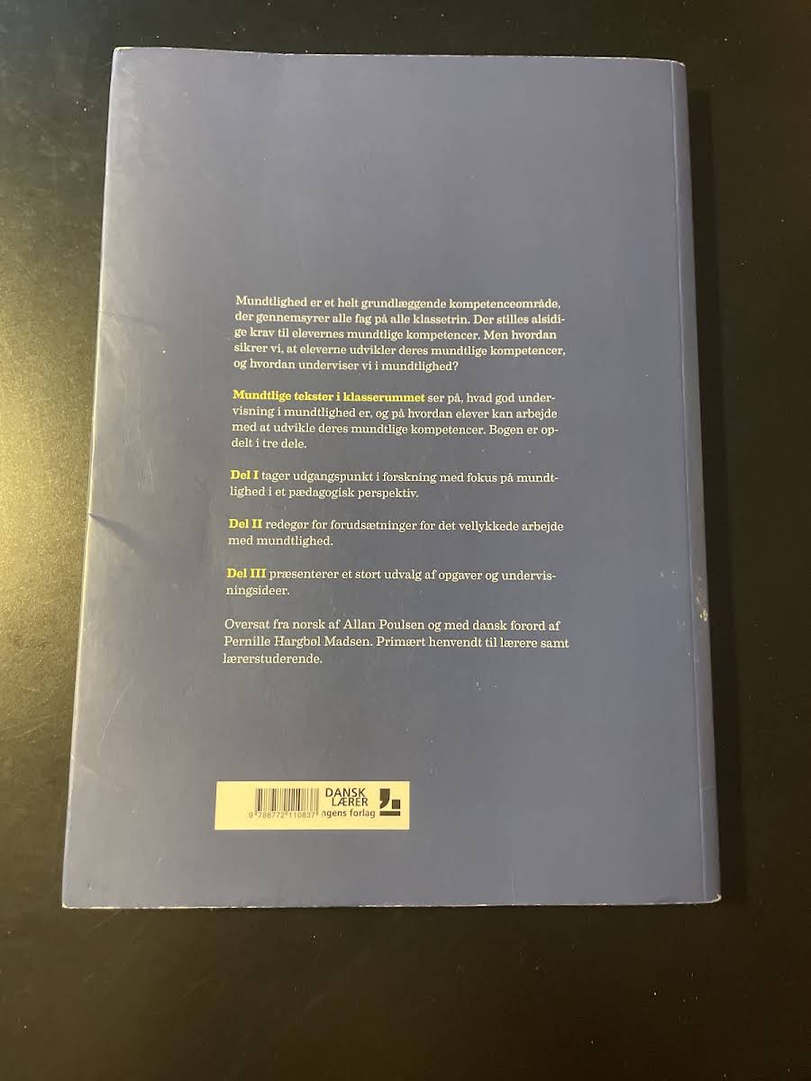 Mundtlige tekster i klasserummet undersøger, hvad der kendetegner en effektiv undervisning i mundtlighed, og hvordan elever kan styrke deres evner til at kommunikere. Bogen er struktureret i tre dele, hvor Del I præsenterer forskning, der belyser mundtlighedens pædagogiske fundament. I Del II uddybes de væsentlige forudsætninger, som sikrer et vellykket arbejde med mundtlighed, mens Del III byder på et inspirerende udvalg af opgaver og undervisningsidéer. Med sin tilgang henvender bogen sig primært til lærere og lærerstuderende, som ønsker at berige deres undervisningspraksis. Oversat fra norsk af Allan Poulsen og med dansk forord af Pernille Hargbøl Madsen, giver bogen redskaber til at fremme en dynamisk og engageret mundtlig undervisning i klasserummet.