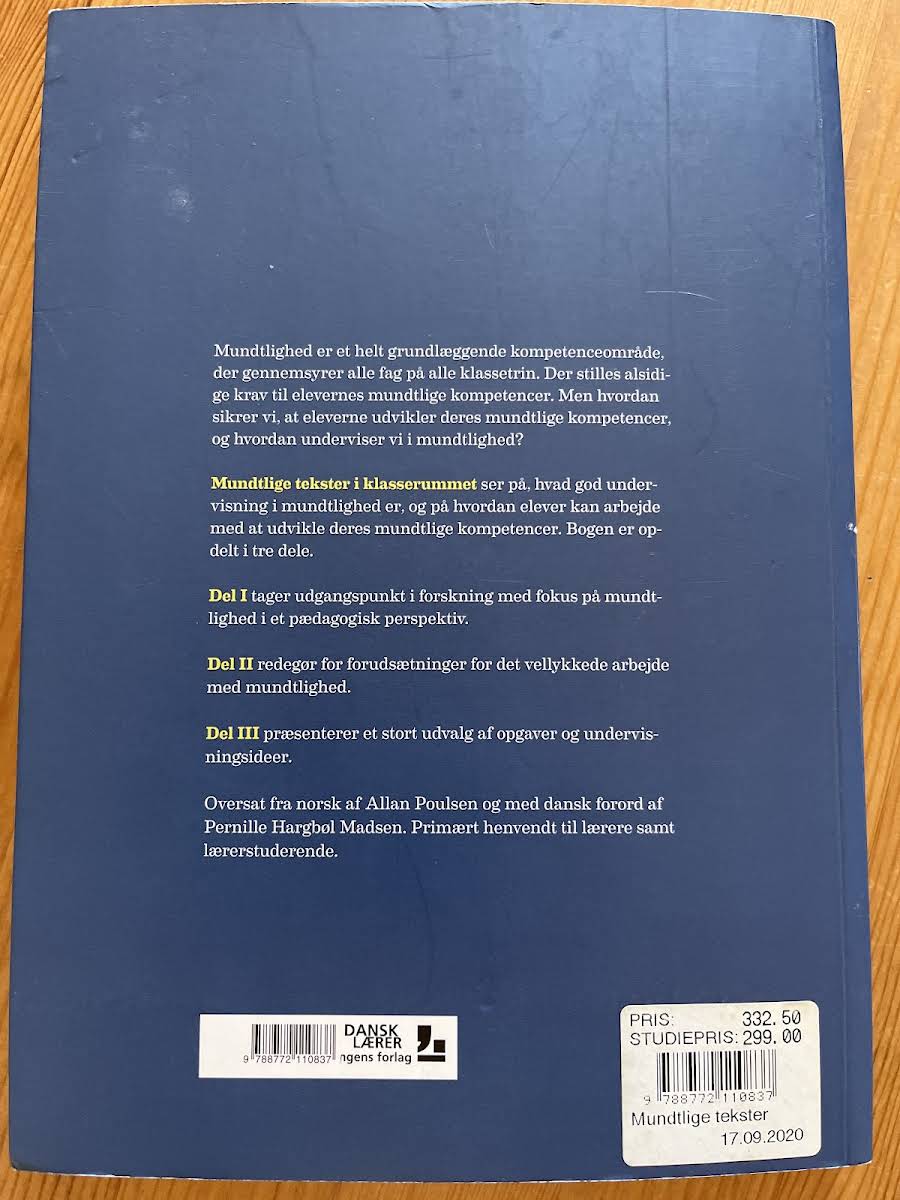 Mundtlige tekster i klasserummet undersøger, hvad der kendetegner en effektiv undervisning i mundtlighed, og hvordan elever kan styrke deres evner til at kommunikere. Bogen er struktureret i tre dele, hvor Del I præsenterer forskning, der belyser mundtlighedens pædagogiske fundament. I Del II uddybes de væsentlige forudsætninger, som sikrer et vellykket arbejde med mundtlighed, mens Del III byder på et inspirerende udvalg af opgaver og undervisningsidéer. Med sin tilgang henvender bogen sig primært til lærere og lærerstuderende, som ønsker at berige deres undervisningspraksis. Oversat fra norsk af Allan Poulsen og med dansk forord af Pernille Hargbøl Madsen, giver bogen redskaber til at fremme en dynamisk og engageret mundtlig undervisning i klasserummet.