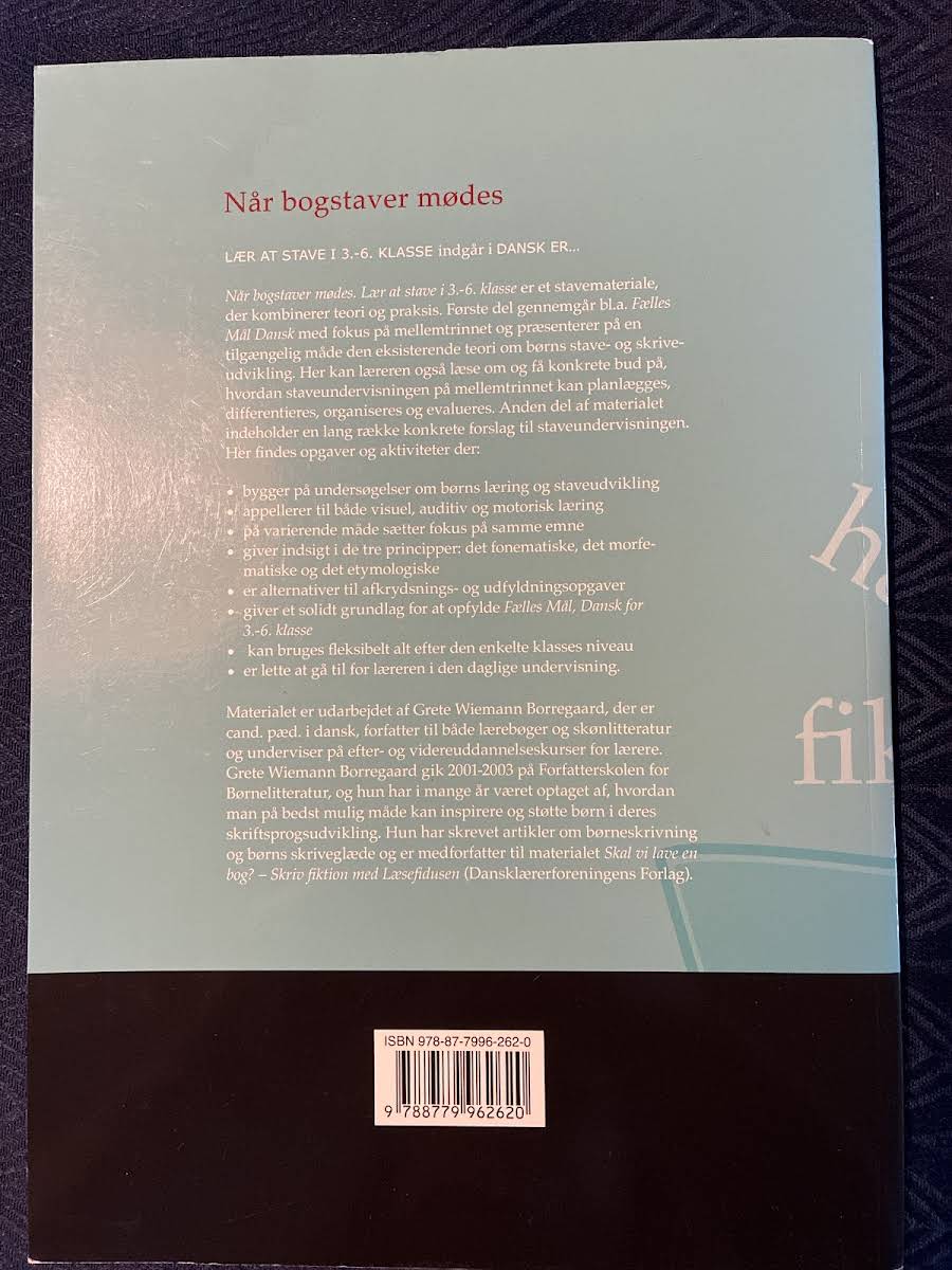 Når bogstaver mødes. Lær at stave i 3.-6. klasse er et gennemarbejdet materiale, der samler teori og praksis i én løsning målrettet mellemtrinnets staveundervisning. Bogen giver et overblik over både de gældende Fælles Mål og danskfagets målsætninger og sætter elevernes stave- og skriveudvikling i centrum. I bogens første del præsenteres eksisterende teori om børns stavning og skrivning på en overskuelig måde. Her får læreren konkrete anvisninger på, hvordan undervisningen kan planlægges, differentieres, organiseres og evalueres i forhold til den enkelte klasses behov. Anden del rummer et rigt udvalg af opgaver og aktiviteter, som bygger på nyeste undersøgelser om børns læring. Øvelserne kan tilpasses forskellige niveauer, tager afsæt i samme temaer og er lette at inddrage i den daglige undervisning. Materialet er udarbejdet af Grete Wiemann Borregaard, cand.pæd. i dansk, forfatter til både lærebøger og skønlitteratur og erfaren underviser på efter- og videreuddannelseskurser for lærere.