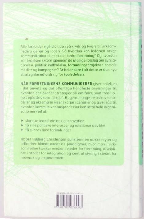 I "Når forretningen kommunikerer" præsenterer Jesper Højberg Christensen en moderne tilgang til, hvordan kommunikation kan blive en central strategisk ressource i virksomheden. Bogen følger udviklingen fra de tidlige propagandametoder til den nuancerede dialog, der kendetegner nutidens digitale landskab, og viser, hvordan en målrettet kommunikationsstrategi kan styrke både ledelse og organisation. Med et væld af modeller, konkrete eksempler og praktiske råd hjælper bogen topledelsen med at navigere i de komplekse kommunikationsudfordringer. Den giver indsigt i, hvordan man skærper brandet, fremmer innovation samt udvikler politiske relationer og forandringsprojekter – alt sammen med det formål at løfte virksomhedens samlede performance gennem en integreret og empowerende tilgang til kommunikation.