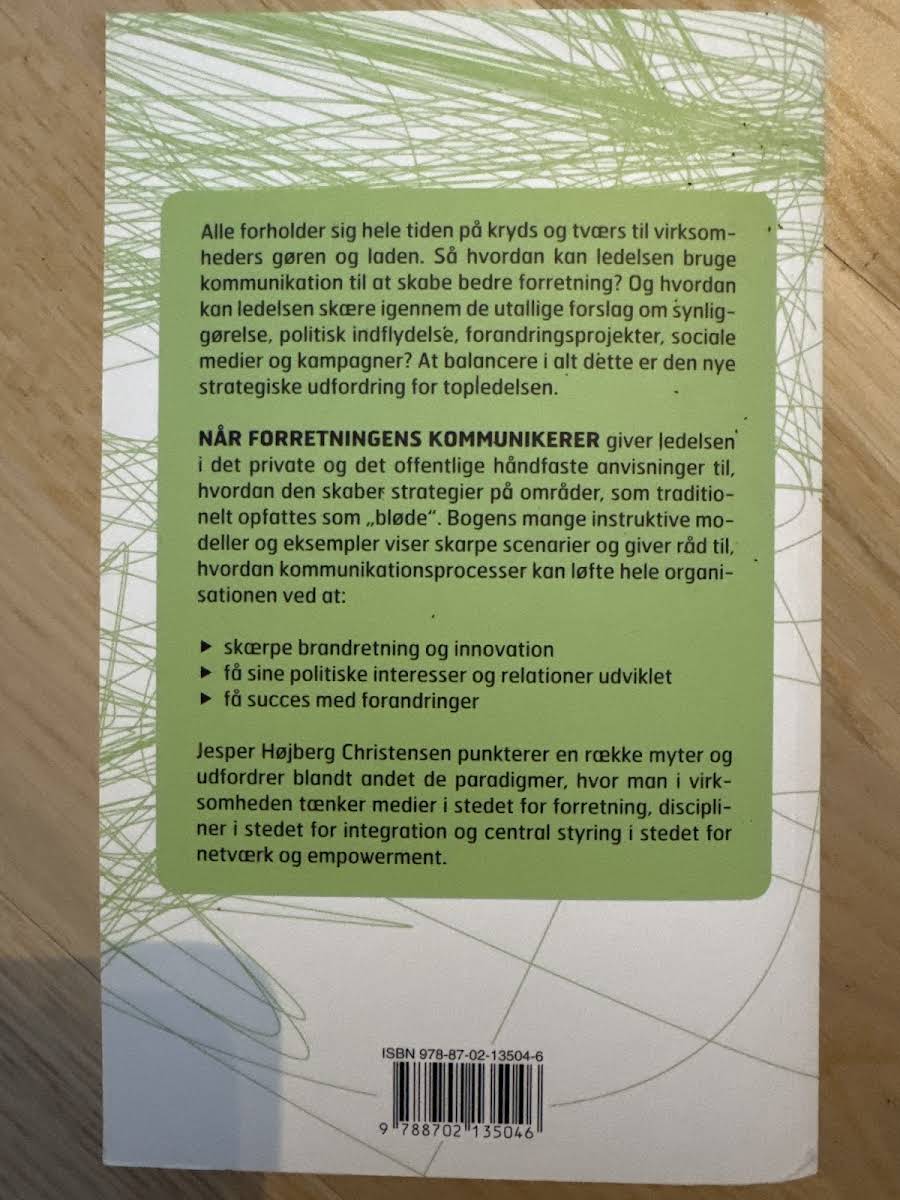 I "Når forretningen kommunikerer" præsenterer Jesper Højberg Christensen en moderne tilgang til, hvordan kommunikation kan blive en central strategisk ressource i virksomheden. Bogen følger udviklingen fra de tidlige propagandametoder til den nuancerede dialog, der kendetegner nutidens digitale landskab, og viser, hvordan en målrettet kommunikationsstrategi kan styrke både ledelse og organisation. Med et væld af modeller, konkrete eksempler og praktiske råd hjælper bogen topledelsen med at navigere i de komplekse kommunikationsudfordringer. Den giver indsigt i, hvordan man skærper brandet, fremmer innovation samt udvikler politiske relationer og forandringsprojekter – alt sammen med det formål at løfte virksomhedens samlede performance gennem en integreret og empowerende tilgang til kommunikation.