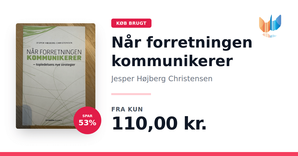 Lige nu kan du købe "Når forretningen kommunikerer" af Jesper Højberg Christensen til kun 110,00 kr. Du sparer hele 53% af nyprisen! Bogen du ser her er brugt, og i god stand. Vi har i øjeblikket 4 eksemplarer til salg af "Når forretningen kommunikerer", så husk at se de forskellige udgaver.
