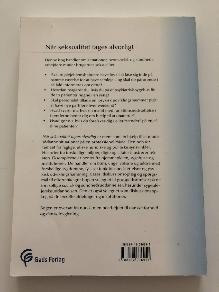 "Når seksualitet tages alvorligt" giver et nuanceret indblik i de mange facetter af seksualitetens rolle i mødet mellem brugere og fagpersoner inden for det sociale og sundhedsmæssige område. Bogen stiller skarpt på de etiske, juridiske og faglige dilemmaer, der kan opstå, når intimitet og pleje skal forenes i hverdagen. Med konkrete problemstillinger som: Skal to ældre medborgere på et plejehjem have mulighed for privat samleje – og skal pårørende i så fald informeres? Skal personalet tillade, at en ung udviklingshæmmet pige har en ny partner hver dag? Hvad skal man gøre, hvis to patienter på et psykiatrisk hospital findes sammen nøgne i én seng, eller hvis en handicappet beder om hjælp til onani? Bogen sætter disse spørgsmål i perspektiv og giver stof til refleksion og debat. Gennem eksempler, citater og praktiske opgaver, herunder forslag til rollespil, bliver bogen et værdifuldt redskab for fagpersoner i deres daglige arbejde og undervisning. Den opfordrer til en åben og reflekteret dialog om, hvordan man bedst navigerer mellem omsorg, intimitet og professionalisme i en kompleks virkelighed. Udgivet i 2001 af Gads Forlag i samarbejde med Formidlingscenter Øst, er "Når seksualitet tages alvorligt" en essentiel ressource for alle, der ønsker at forstå og forholde sig til de mange etiske aspekter af seksualitet i social- og sundhedssektoren.