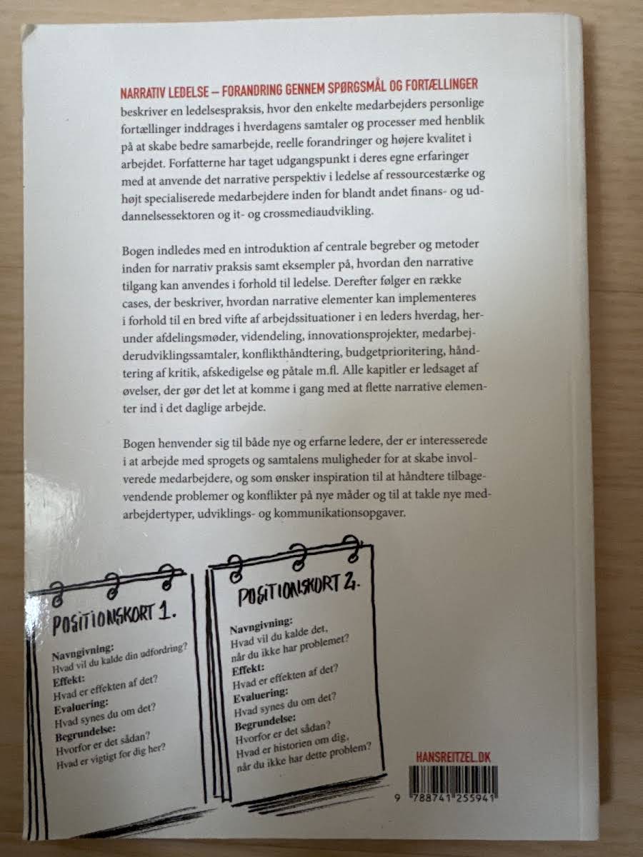 I "Narrativ ledelse" introducerer Henriette Moos, Stig Geer Pedersen og Mette Trangbæk en indsigtfuld tilgang til ledelse, hvor samtalen og de små dagligdags interaktioner bliver nøglen til udvikling og fornyelse. Bogen understreger, at meningsfuld ledelse opstår gennem relationer, hvor fortællemåder og dialog åbner op for innovative og anerkendende løsninger. Med udgangspunkt i et narrativt perspektiv lærer lederen at håndtere både rationelle og irrationelle aspekter af de daglige situationer. Ved at sætter fokus på den personlige fortælling i de små øjeblikke, tilbyder bogen redskaber til effektiv konfliktløsning og styrkelse af samarbejdet. Denne tilgang fremmer en ledelsesstil, hvor medarbejdernes trivsel og inddragelse er i centrum. "Narrativ ledelse" er et vigtigt værktøj for ledere, der ønsker at skabe en arbejdsplads, hvor kommunikation og fortællinger danner grundlag for forandring. Bogen viser, hvordan man, gennem aktiv lytning og meningsfulde samtaler, kan gøre en forskel i hverdagen.