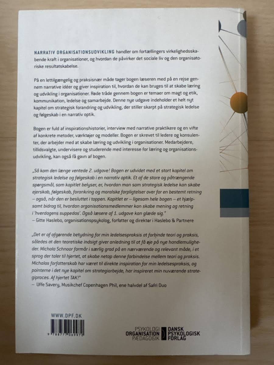 "Narrativ organisationsudvikling" af Michala Schnoor sætter fokus på fortællingers evne til at skabe virkelighed i organisationer og belyser, hvordan narrative elementer påvirker både det sociale miljø og den organisatoriske resultatskabelse. Bogen er udformet i et letforståeligt og praksisnært format, hvor fortællinger og narrative metoder sættes i centrum for at skabe læring og udvikling. I denne anden udgave er der desuden tilføjet et nyt kapitel, der dykker ned i strategisk forandring og udvikling med et særligt narrativt perspektiv. Gennem inspirerende casehistorier, interviews med narrative praktikere og en bred vifte af konkrete metoder, værktøjer og modeller, får læseren redskaberne til at anvende narrative idéer i praksis. Bogen henvender sig til ledere og konsulenter, der ønsker at fremme læring og udvikling i organisationer. Ligeledes kan medarbejdere, tillidsrepræsentanter, undervisere og studerende med interesse for organisationsudvikling finde værdi i de narrative tilgange, der præsenteres i værket.