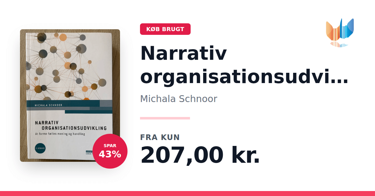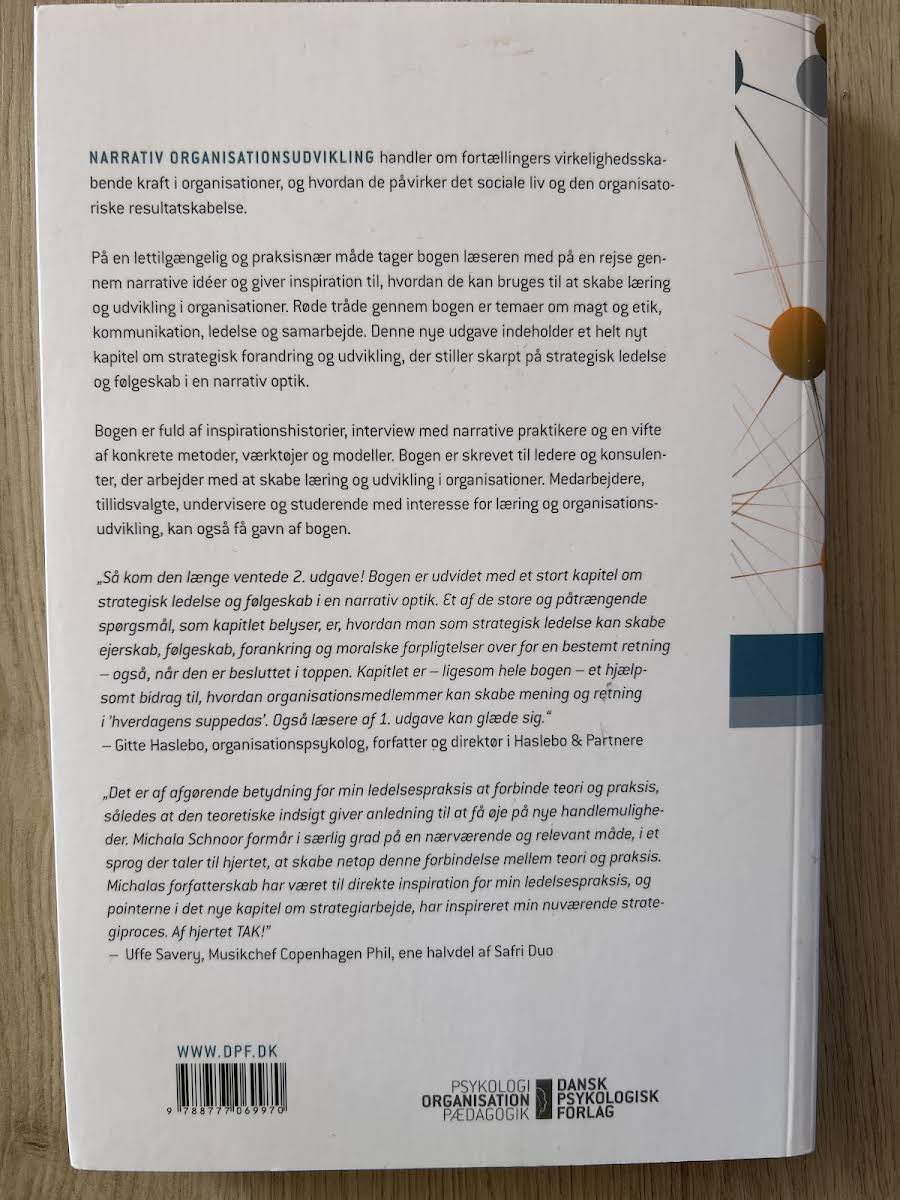 "Narrativ organisationsudvikling" af Michala Schnoor sætter fokus på fortællingers evne til at skabe virkelighed i organisationer og belyser, hvordan narrative elementer påvirker både det sociale miljø og den organisatoriske resultatskabelse. Bogen er udformet i et letforståeligt og praksisnært format, hvor fortællinger og narrative metoder sættes i centrum for at skabe læring og udvikling. I denne anden udgave er der desuden tilføjet et nyt kapitel, der dykker ned i strategisk forandring og udvikling med et særligt narrativt perspektiv. Gennem inspirerende casehistorier, interviews med narrative praktikere og en bred vifte af konkrete metoder, værktøjer og modeller, får læseren redskaberne til at anvende narrative idéer i praksis. Bogen henvender sig til ledere og konsulenter, der ønsker at fremme læring og udvikling i organisationer. Ligeledes kan medarbejdere, tillidsrepræsentanter, undervisere og studerende med interesse for organisationsudvikling finde værdi i de narrative tilgange, der præsenteres i værket.