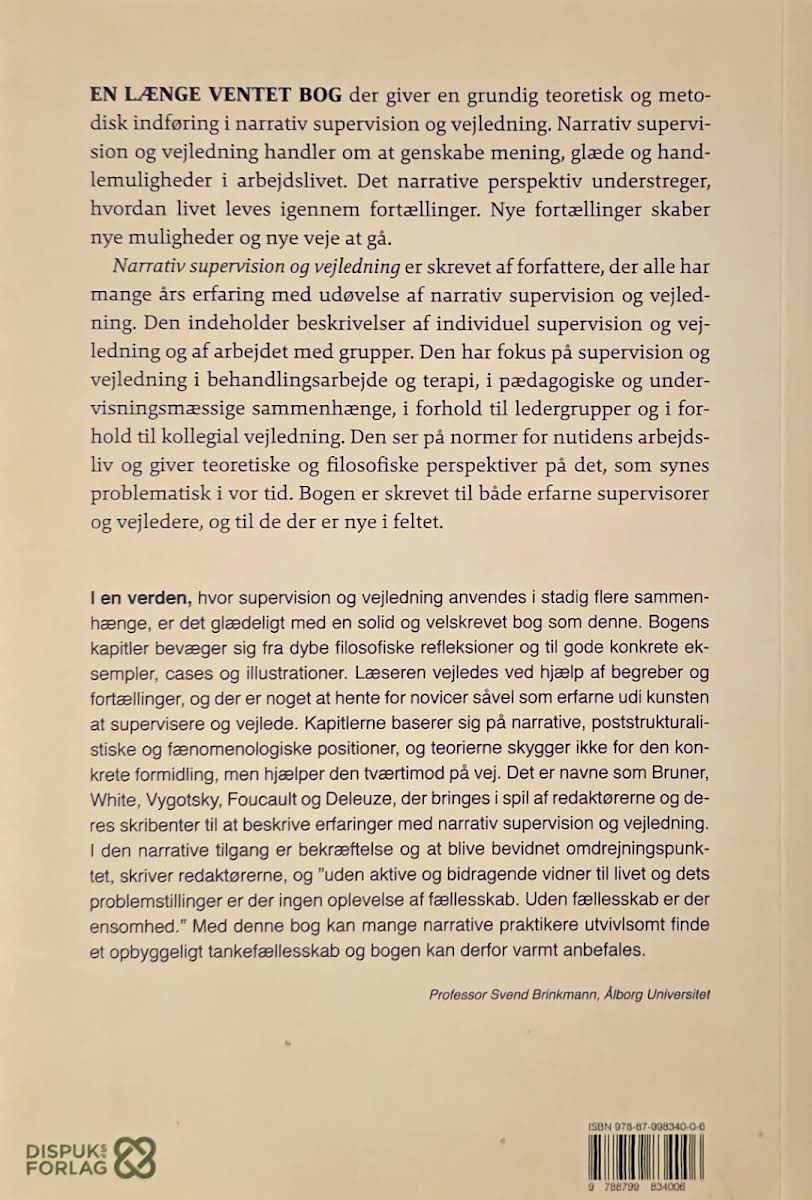"Narrativ supervision og vejledning" er en grundigt udarbejdet bog, der giver en teoretisk og metodisk indføring i den narrative tilgang til supervision og vejledning. Bogen udforsker, hvordan fortællinger kan skabe nye perspektiver, genopbygge mening og åbne op for handlemuligheder i forskellige professionelle sammenhænge. Med bidrag fra erfarne praktikere inden for supervision, terapi, pædagogik og ledelse, tilbyder værket et nuanceret blik på, hvordan narrativ metode kan anvendes til at guide både enkeltpersoner og grupper. Gennem en kombination af teoretiske refleksioner og praktiske eksempler bliver læseren inspireret til at anvende fortællinger som et redskab til at styrke fællesskabet og den professionelle udvikling. Bogen er en værdifuld ressource for både de nye og erfarne inden for området, og den tilbyder indsigt i, hvordan man med narrativ supervision og vejledning kan håndtere de udfordringer, der kendetegner moderne arbejdsliv. Med sit klare og engagerede sprog er "Narrativ supervision og vejledning" et uundværligt redskab for alle, der ønsker at fremme forståelsen og brugen af den narrative metode i deres arbejde.