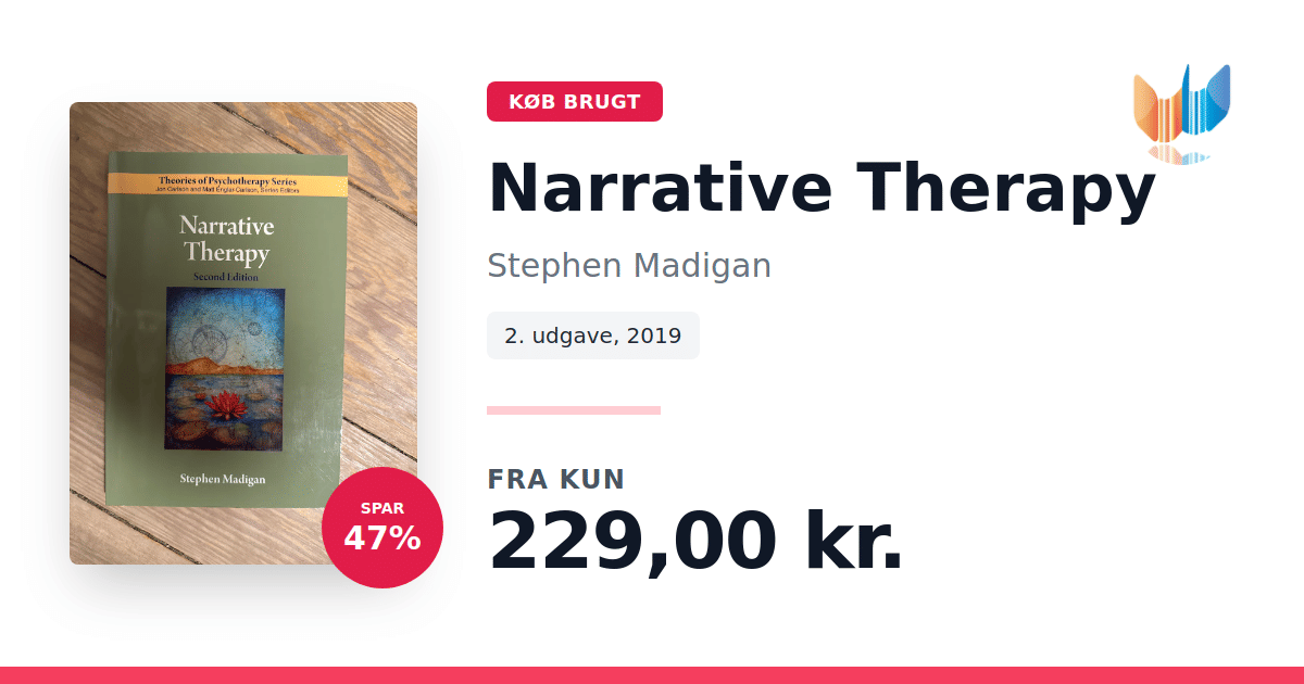 Lige nu kan du købe "Narrative Therapy" af Stephen Madigan til kun 229,00 kr. Du sparer hele 47% af nyprisen! Bogen du ser her er brugt, og i perfekt stand. Vi har i øjeblikket kun et enkelt eksemplar til salg af "Narrative Therapy", så slå til mens du kan!