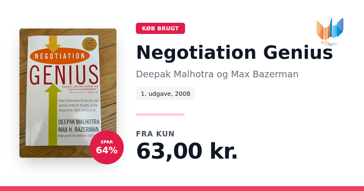 Lige nu kan du købe "Negotiation Genius" af Deepak Malhotra og Max Bazerman til kun 63,00 kr. Du sparer hele 64% af nyprisen! Bogen du ser her er brugt, og i perfekt stand. Vi har i øjeblikket kun et enkelt eksemplar til salg af "Negotiation Genius", så slå til mens du kan!