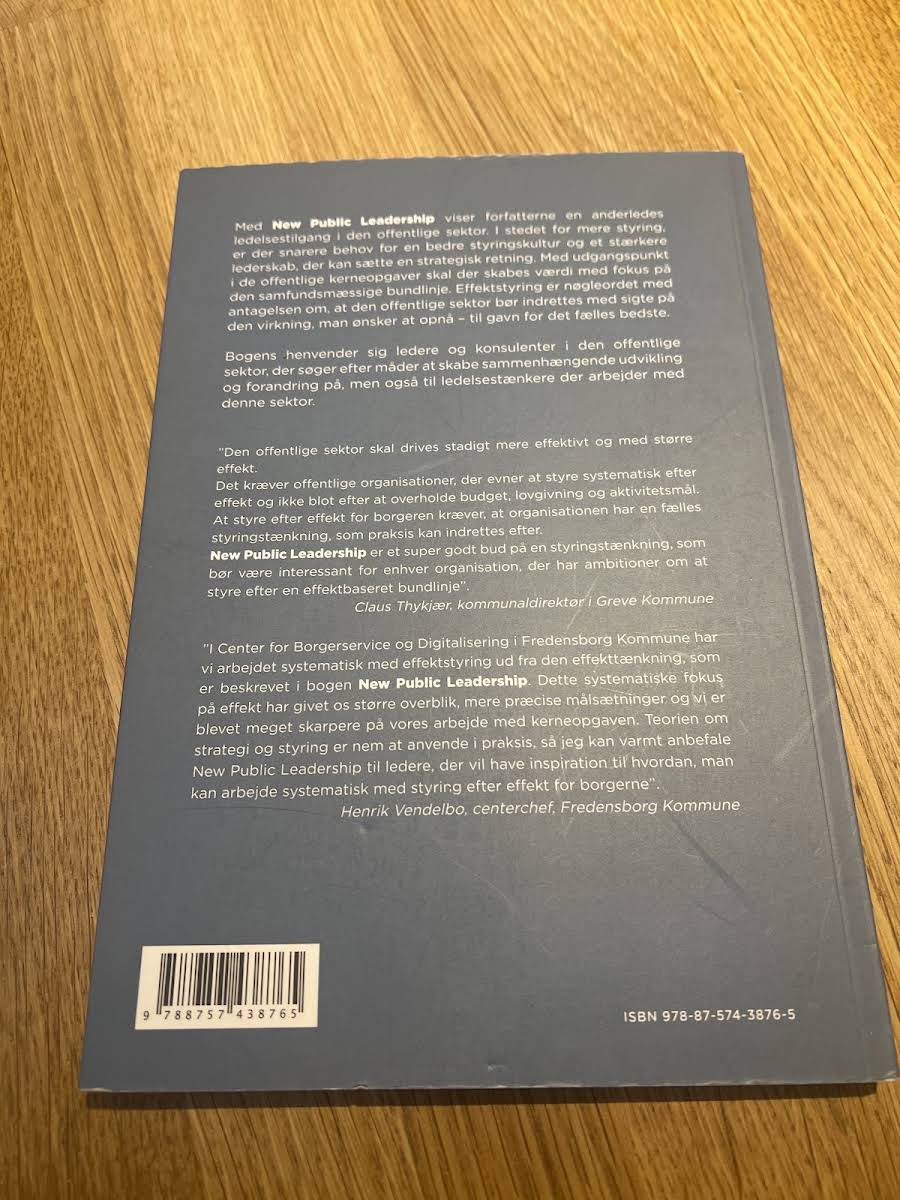 "New Public Leadership – fra strategi til effekt" udfordrer den traditionelle tilgang til ledelse i den offentlige sektor ved at fremhæve vigtigheden af et stærkt og strategisk lederskab, der understøtter en effektiv styringskultur. Martin Lundkvist og Nicolai Vedsted peger i deres værk på, at det offentlige kan opnå større samfundsmæssige resultater, når kerneopgaverne udgør udgangspunktet for værdiskabelsen. Bogen retter sig mod ledere og konsulenter, der ønsker at skabe bæredygtig udvikling og forandring gennem en sammenhængende tilgang til strategi, styring og ledelse. Med et klart fokus på den samfundsmæssige bundlinje præsenterer forfatterne en ny måde at se offentlig ledelse på – en tilgang, der forener teori og praksis i en dynamisk og virkningsorienteret kontekst.