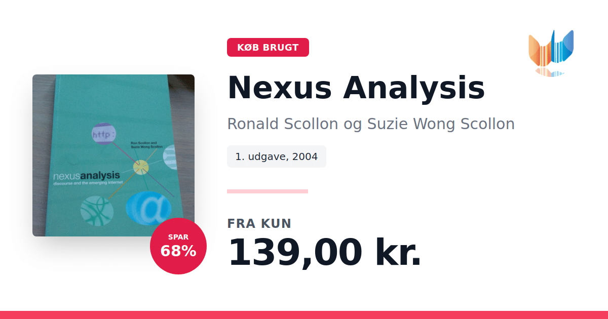 Lige nu kan du købe "Nexus Analysis" af Ronald Scollon og Suzie Wong Scollon til kun 139,00 kr. Du sparer hele 70% af nyprisen! Bogen du ser her er brugt, og i god stand. Vi har i øjeblikket kun et enkelt eksemplar til salg af "Nexus Analysis", så slå til mens du kan!