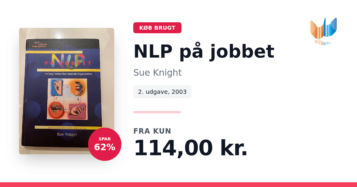 Lige nu kan du købe "NLP på jobbet" af Sue Knight til kun 114,00 kr. Du sparer hele 62% af nyprisen! Bogen du ser her er brugt, og i perfekt stand. Vi har i øjeblikket kun et enkelt eksemplar til salg af "NLP på jobbet", så slå til mens du kan!