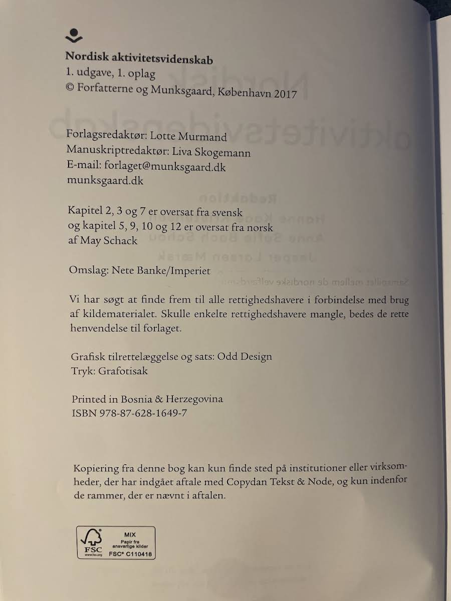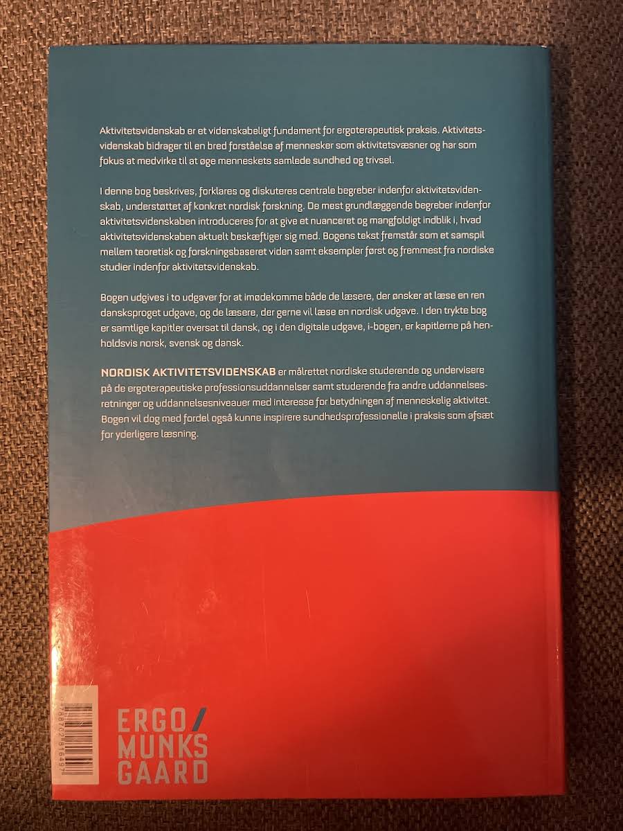 Nordisk aktivitetsvidenskab tilbyder et solidt videnskabeligt grundlag for ergoterapeutisk praksis med fokus på den menneskelige aktivitet og dens betydning for sundhed og trivsel. Bogen forklarer og diskuterer centrale begreber inden for aktivitetsvidenskab og illustrerer dem med konkrete eksempler og resultater fra nordisk forskning. Med et samspil mellem teoretisk indsigt og empiriske studier giver bogen et nuanceret billede af, hvordan menneskelig aktivitet forstås og integreres i ergoterapeutisk praksis. Kapitlerne introducerer læseren for de basale, men afgørende aspekter af faget, som danner udgangspunkt for både grundlæggende og videregående læsning. Udgivet af Gyldendal i 2017 og udgivet i en ren dansksproget version, henvender Nordisk aktivitetsvidenskab sig primært til nordiske studerende og undervisere på ergoterapeutiske professionsuddannelser, men vil med fordel kunne anvendes af alle med interesse for den tværfaglige forskning og forståelse af menneskelig aktivitet.