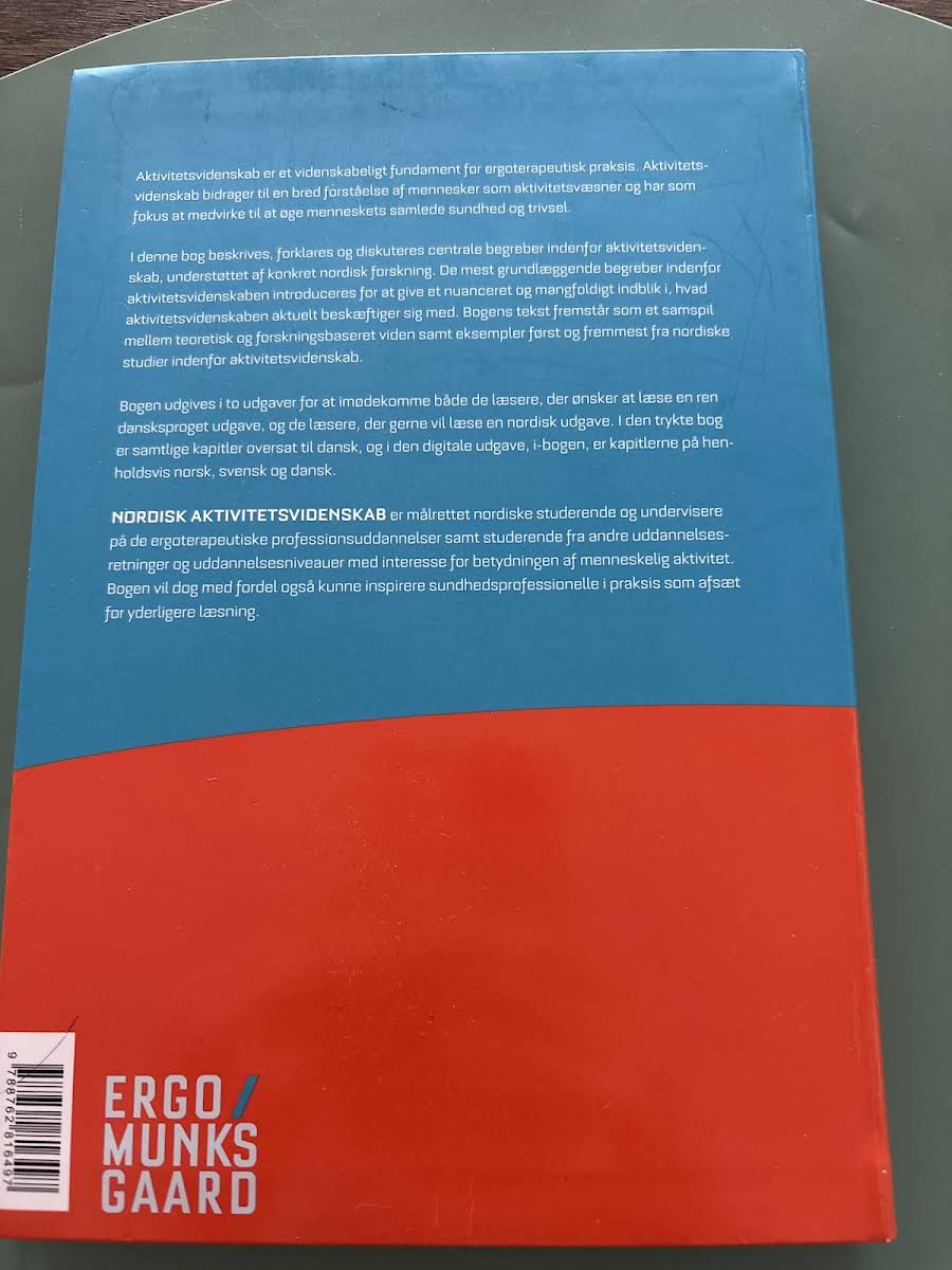 Nordisk aktivitetsvidenskab tilbyder et solidt videnskabeligt grundlag for ergoterapeutisk praksis med fokus på den menneskelige aktivitet og dens betydning for sundhed og trivsel. Bogen forklarer og diskuterer centrale begreber inden for aktivitetsvidenskab og illustrerer dem med konkrete eksempler og resultater fra nordisk forskning. Med et samspil mellem teoretisk indsigt og empiriske studier giver bogen et nuanceret billede af, hvordan menneskelig aktivitet forstås og integreres i ergoterapeutisk praksis. Kapitlerne introducerer læseren for de basale, men afgørende aspekter af faget, som danner udgangspunkt for både grundlæggende og videregående læsning. Udgivet af Gyldendal i 2017 og udgivet i en ren dansksproget version, henvender Nordisk aktivitetsvidenskab sig primært til nordiske studerende og undervisere på ergoterapeutiske professionsuddannelser, men vil med fordel kunne anvendes af alle med interesse for den tværfaglige forskning og forståelse af menneskelig aktivitet.