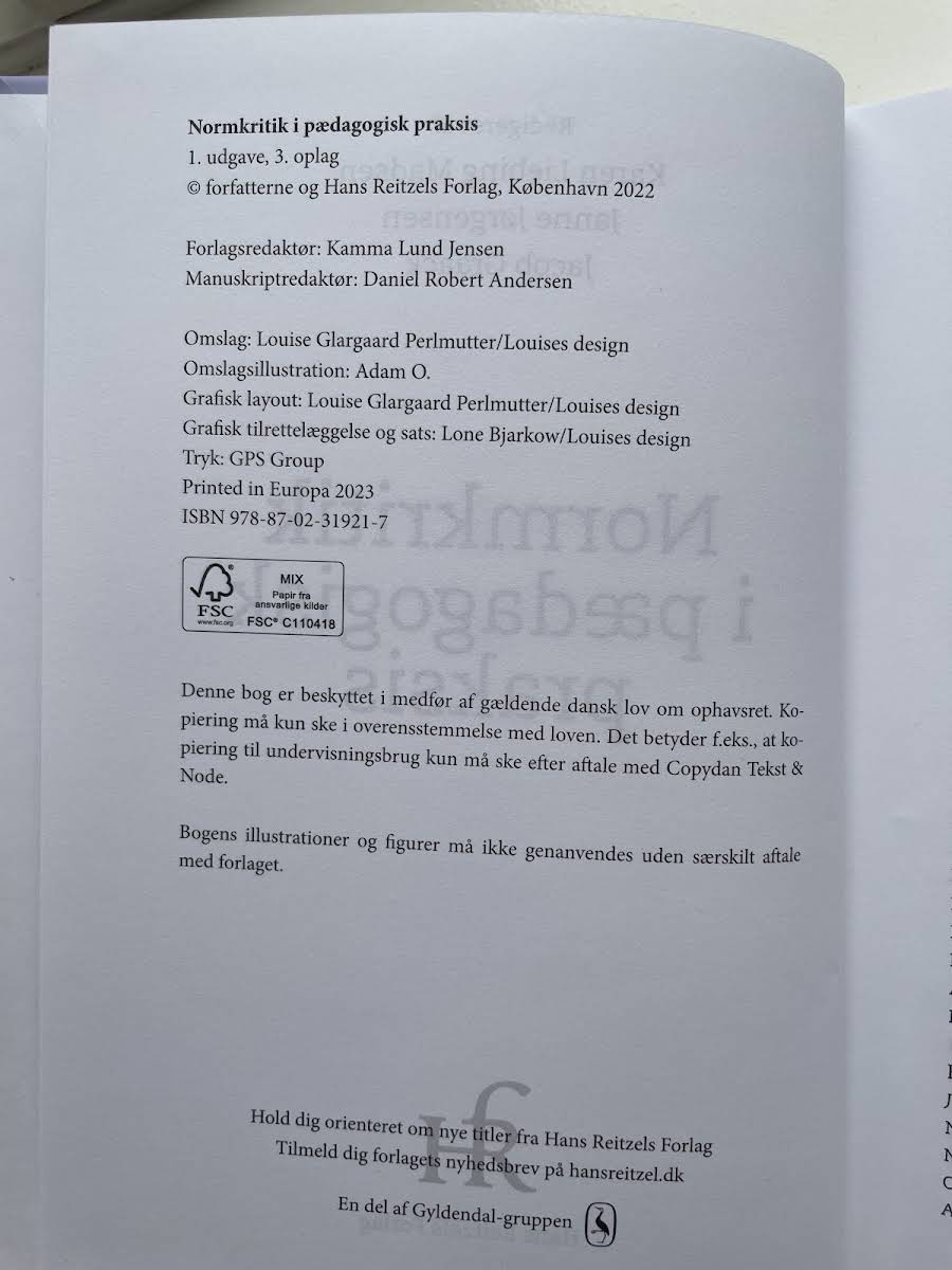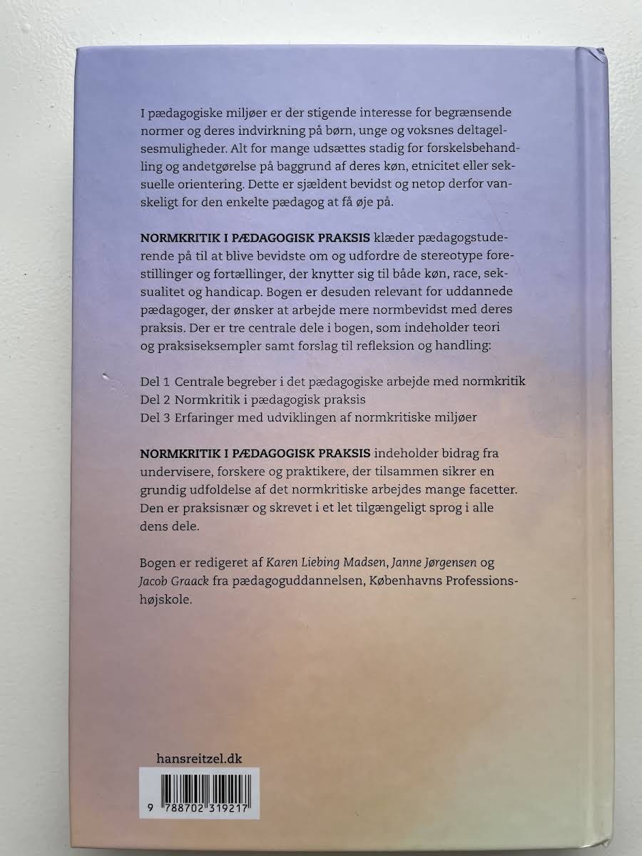 "Normkritik i pædagogisk praksis" giver et engageret indblik i, hvordan normkritiske perspektiver kan integreres i daglig pædagogisk arbejde. Bogen henvender sig både til pædagogstuderende og til uddannede pædagoger, der ønsker at udfordre og reflektere over traditionelle forestillinger om køn, race, handicap og seksualitet. Gennem en velstruktureret opdeling præsenterer bogen teori, praksiseksempler samt konkrete forslag til refleksion og handling. Bidrag fra undervisere, forskere og praktikere sikrer en nuanceret fremstilling af normkritikkens mange facetter og den positive indflydelse, den kan have på skabelsen af mere inkluderende miljøer. Udgivet af Hans Reitzels Forlag i 2022 og med 360 sider, tilbyder denne paperback et både tilgængeligt og virkelighedsnært redskab for dem, der ønsker at styrke deres pædagogiske praksis gennem en normkritisk tilgang.
