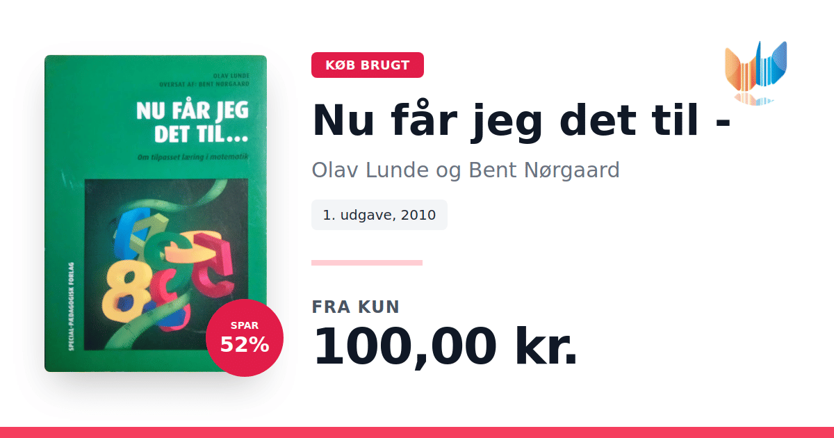 Lige nu kan du købe "Nu får jeg det til -" af Olav Lunde og Bent Nørgaard til kun 100,00 kr. Du sparer hele 52% af nyprisen! Bogen du ser her er brugt, og i god stand. Vi har i øjeblikket kun et enkelt eksemplar til salg af "Nu får jeg det til -", så slå til mens du kan!
