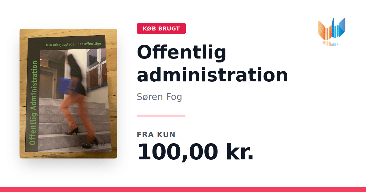 Lige nu kan du købe "Offentlig administration" af Søren Fog til kun 100,00 kr. Bogen du ser her er brugt, og i god stand. Vi har i øjeblikket 2 eksemplarer til salg af "Offentlig administration", så husk at se de forskellige udgaver.