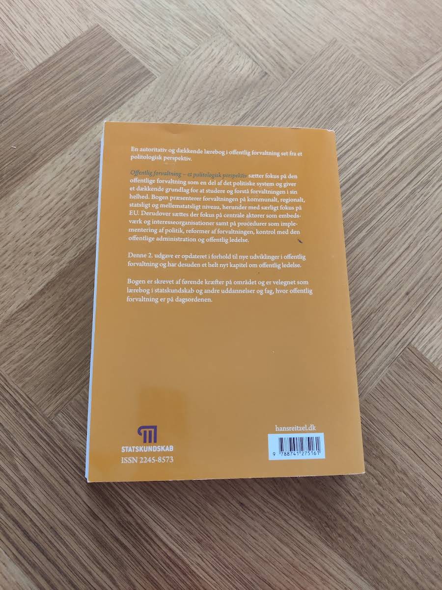 "Offentlig forvaltning – Et politologisk perspektiv" er en grundig og autoritativ lærebog, der sætter offentlig forvaltning ind i en politologisk kontekst. I denne 2. udgave præsenteres forvaltningen som en integreret del af det politiske system, hvor samspillet mellem kommunale, regionale, statslige og internationale aktører understreges med særlig opmærksomhed på EU. Bogen giver et solidt grundlag for at analysere og forstå de processer og procedurer, der former den offentlige administration. I den opdaterede udgave er der tilføjet et nyt kapitel om offentlig ledelse, som tilfører en ekstra dimension til studiet af forvaltningen. Med fokus på centrale aktører såsom embedsværket og interesseorganisationer, belyser bogen vigtige emner som implementering af politik, reformer og kontrol med den offentlige administration. Det samlede perspektiv gør bogen til et uundværligt værktøj for studerende og professionelle, der ønsker en dybere indsigt i den offentlige forvaltning."