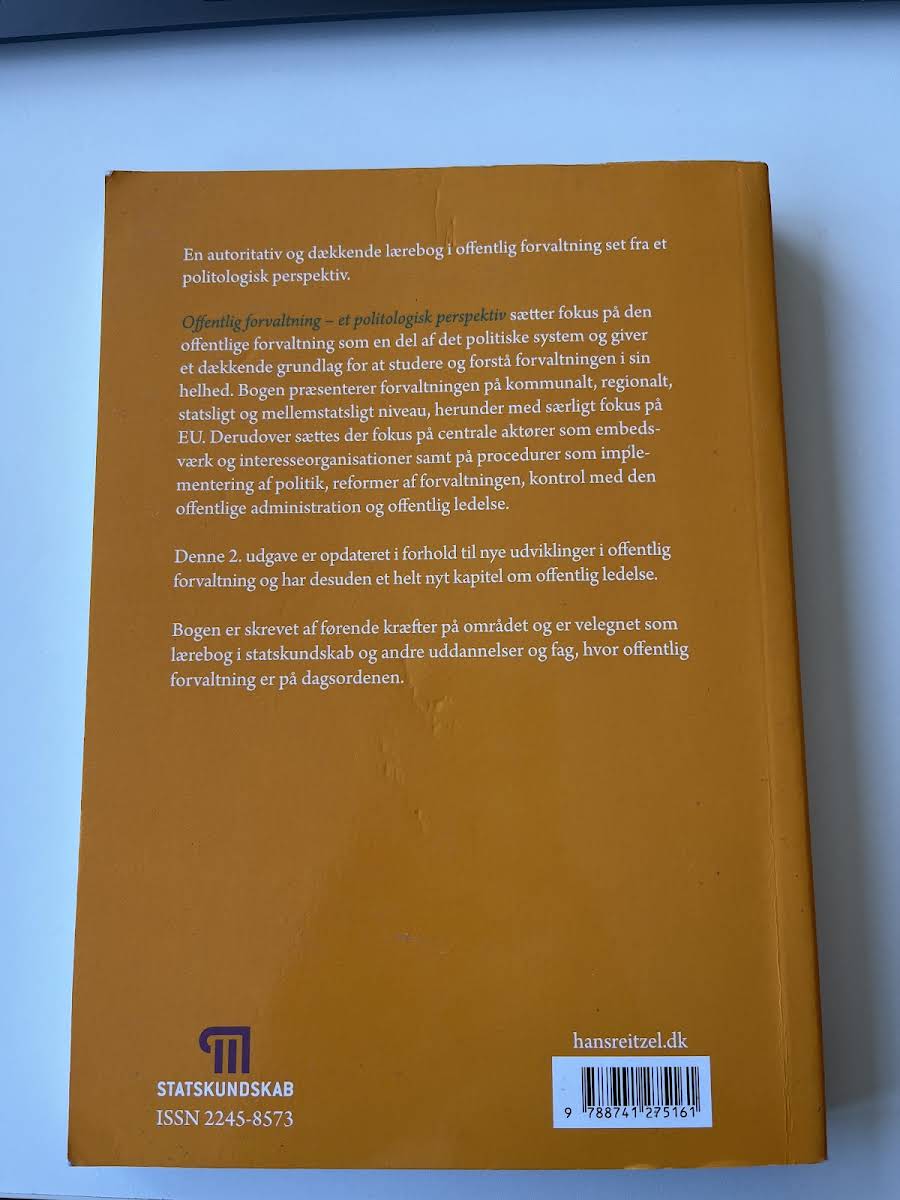 "Offentlig forvaltning – Et politologisk perspektiv" er en grundig og autoritativ lærebog, der sætter offentlig forvaltning ind i en politologisk kontekst. I denne 2. udgave præsenteres forvaltningen som en integreret del af det politiske system, hvor samspillet mellem kommunale, regionale, statslige og internationale aktører understreges med særlig opmærksomhed på EU. Bogen giver et solidt grundlag for at analysere og forstå de processer og procedurer, der former den offentlige administration. I den opdaterede udgave er der tilføjet et nyt kapitel om offentlig ledelse, som tilfører en ekstra dimension til studiet af forvaltningen. Med fokus på centrale aktører såsom embedsværket og interesseorganisationer, belyser bogen vigtige emner som implementering af politik, reformer og kontrol med den offentlige administration. Det samlede perspektiv gør bogen til et uundværligt værktøj for studerende og professionelle, der ønsker en dybere indsigt i den offentlige forvaltning."