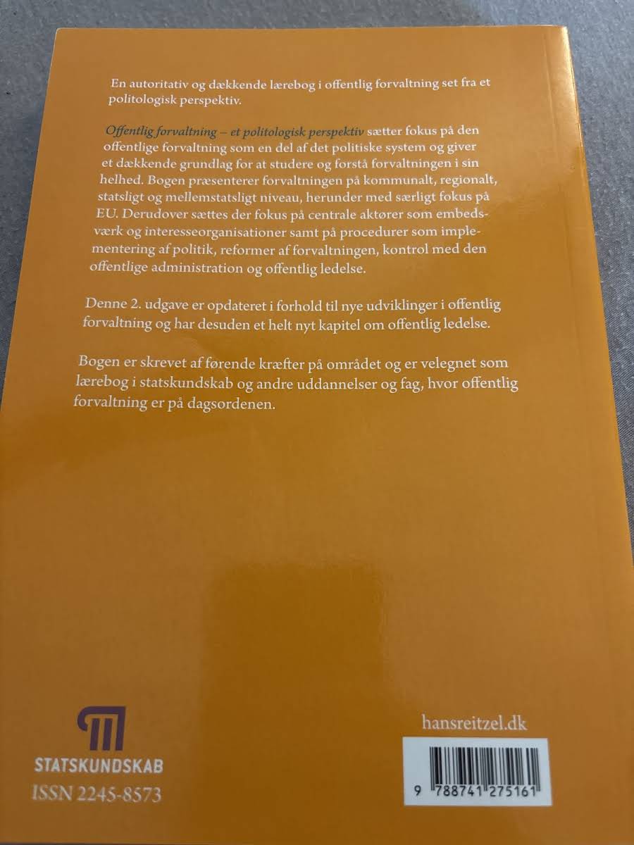 "Offentlig forvaltning – Et politologisk perspektiv" er en grundig og autoritativ lærebog, der sætter offentlig forvaltning ind i en politologisk kontekst. I denne 2. udgave præsenteres forvaltningen som en integreret del af det politiske system, hvor samspillet mellem kommunale, regionale, statslige og internationale aktører understreges med særlig opmærksomhed på EU. Bogen giver et solidt grundlag for at analysere og forstå de processer og procedurer, der former den offentlige administration. I den opdaterede udgave er der tilføjet et nyt kapitel om offentlig ledelse, som tilfører en ekstra dimension til studiet af forvaltningen. Med fokus på centrale aktører såsom embedsværket og interesseorganisationer, belyser bogen vigtige emner som implementering af politik, reformer og kontrol med den offentlige administration. Det samlede perspektiv gør bogen til et uundværligt værktøj for studerende og professionelle, der ønsker en dybere indsigt i den offentlige forvaltning."