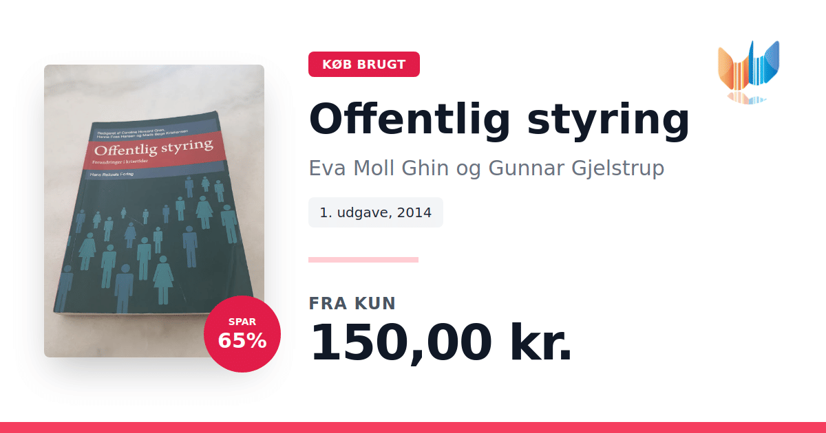 Lige nu kan du købe "Offentlig styring" af Eva Moll Ghin og Gunnar Gjelstrup til kun 150,00 kr. Du sparer hele 65% af nyprisen! Bogen du ser her er brugt, og i god stand. Vi har i øjeblikket 2 eksemplarer til salg af "Offentlig styring", så husk at se de forskellige udgaver.