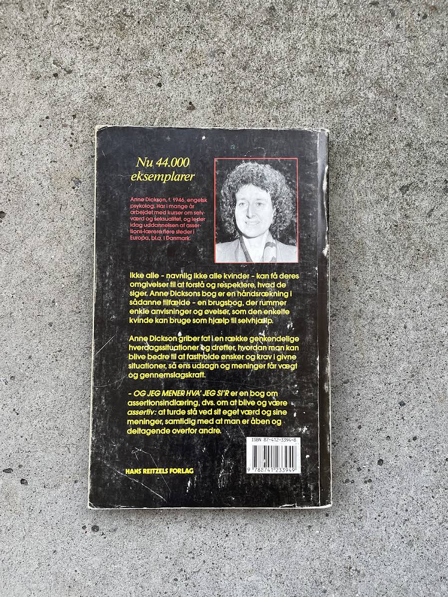 At udtrykke sine behov og få dem mødt med respekt kan ofte være en udfordring – særligt for kvinder. I "og jeg mener hva' jeg si'r" præsenterer Anne Dickson en praktisk guide til assertionsudvikling, som kombinerer letforståelige øvelser med genkendelige hverdagssituationer. Bogen hjælper læseren med at udvikle evnen til både at fastholde sine egne ønsker og samtidig engagere sig åbent med andre. Med en tilgang, der understreger vigtigheden af at stå ved sit eget værd, tilbyder denne 2. udgave fra 2006 en håndsrækning til dem, der søger at forbedre deres kommunikation og selvsikkerhed. Anne Dickson beskriver, hvordan man trin for trin kan lære at opretholde sine krav og skabe gennemslagskraft i dagligdagen – en værdifuld ressource for alle, som ønsker at styrke egen position og samtidig være imødekommende over for sine medmennesker.