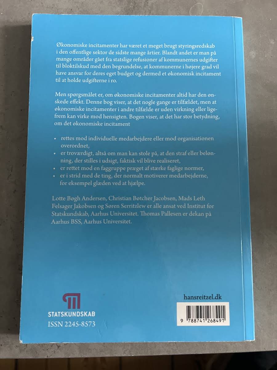 I "Økonomiske incitamenter i den offentlige sektor" foretager Thomas Pallesen, Lotte Bøgh Andersen, Søren Serritzlew, Mads Leth Felsager Jakobsen og Christian Bøtcher Jacobsen en kritisk undersøgelse af, hvordan økonomiske incitamenter anvendes som styringsredskab i den offentlige sektor. Bogen analyserer, om og i hvilket omfang disse incitamenter påvirker adfærden hos offentligt ansatte og myndigheder – fra de tilfælde, hvor de ønskede resultater opnås, til situationer hvor incitamenterne enten er ineffektive eller modvirker intentionerne. Med en grundig gennemgang af incitamenternes design og målretning giver forfatterne et nuanceret billede af, hvordan virkningen afhænger af, om belønninger og sanktioner rettes mod individuelle medarbejdere eller hele organisationen. Bogen fremhæver desuden betydningen af, at incitamenterne er troværdige og afstemt med de normer og værdier, der præger de faggrupper, de er tiltænkt. Denne velskrevne og analytiske fremstilling giver læseren indsigt i de komplekse dynamikker, der ligger bag styringen af den offentlige sektor.