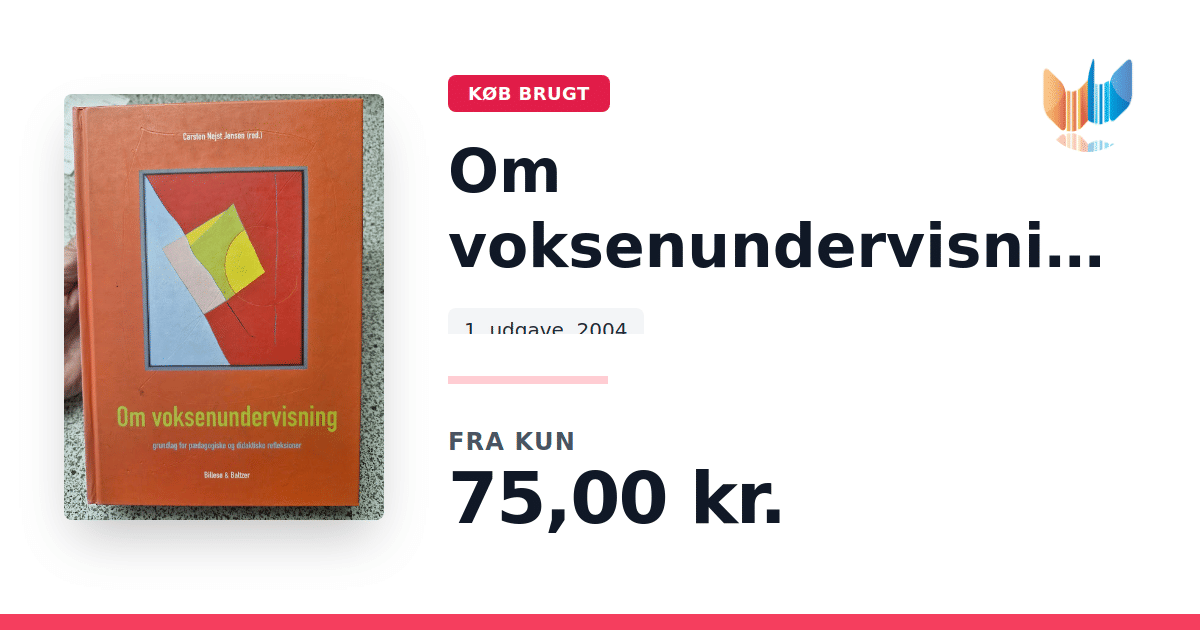 Lige nu kan du købe "Om voksenundervisning" til kun 75,00 kr. Bogen du ser her er brugt, og i perfekt stand. Vi har i øjeblikket 2 eksemplarer til salg af "Om voksenundervisning", så husk at se de forskellige udgaver.