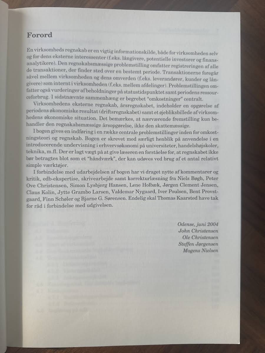 Bogen byder på en grundig introduktion til centrale emner inden for omkostningsteori og regnskab. Med udgangspunkt i virksomhedens værdikredsløb får læseren indblik i, hvordan forskellige omkostningsbegreber defineres og anvendes til at belyse praktiske beslutningssituationer. Dernæst præsenteres bogholderisystemets betydning for den økonomiske beskrivelse af virksomheden, herunder vurderinger af periodens ressourceforbrug og beholdninger på et givent statustidspunkt. Opgørelsen af vareforbrug og periodiseringsudfordringer gennemgås som en naturlig del af den samlede analyse. Afslutningsvis behandles perspektiverne for både interne og eksterne regnskabsopgørelser, hvilket understreger, at regnskab ikke blot er et håndværk af simple teknikker, men en disciplin, hvor erhvervsøkonomisk teori spiller en afgørende rolle.