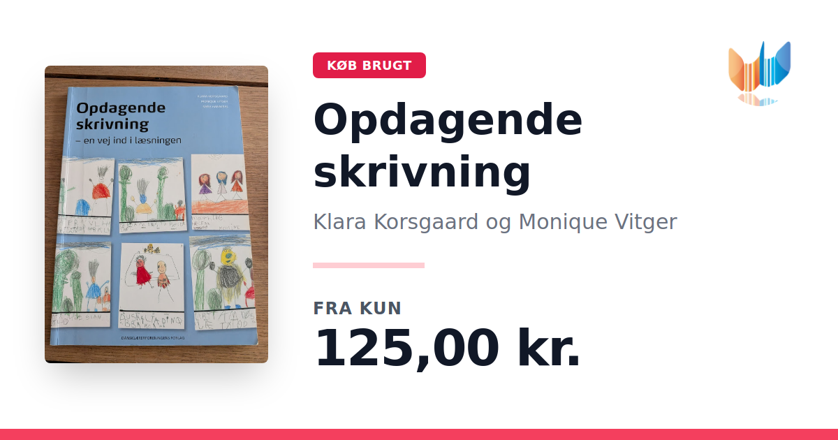 Lige nu kan du købe "Opdagende skrivning" af Klara Korsgaard og Monique Vitger til kun 125,00 kr. Bogen du ser her er brugt, og i god stand. Vi har i øjeblikket 3 eksemplarer til salg af "Opdagende skrivning", så husk at se de forskellige udgaver.