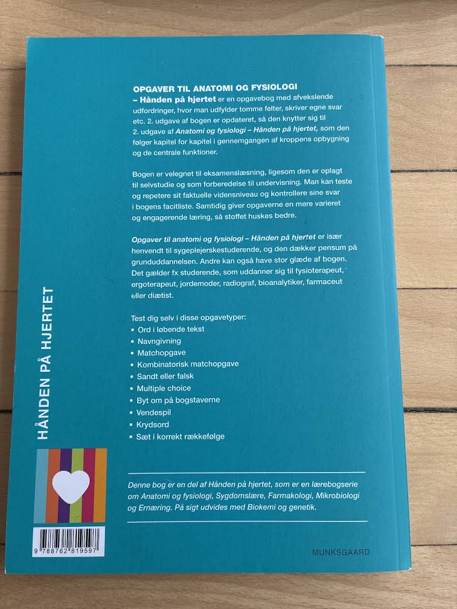 Opgaver til anatomi og fysiologi - Hånden på hjertet er en alsidig opgavebog, hvor du udfylder tomme felter, formulerer egne svar og løser en række forskellige opgavetyper. Bogen gennemgår hele kroppens opbygning og de centrale fysiologiske funktioner og fungerer som et perfekt supplement til Anatomi og fysiologi - Hånden på hjertet. Den er ideel til eksamenslæsning, selvstudie og undervisningsforberedelse. Med muligheden for at teste og repetere dit faktuelle vidensniveau samt tjekke svarene i bogens facitliste, skaber opgaverne en mere engagerende læringsproces, så stoffet huskes bedre. Målgruppen er primært sygeplejestuderende på grunduddannelsen, men også studerende inden for fysioterapi, ergoterapi, jordemoder-, radiograf-, bioanalytiker-, farmaceut- og diætistuddannelser vil finde stor værdi i bogen. Du kan udfordre dig selv med disse opgavetyper: • Ord i løbende tekst • Navngivning • Matchopgave • Kombinatorisk matchopgave • Sandt eller falsk • Multiple choice • Byt om på bogstaverne • Vendespil • Krydsord • Sæt i korrekt rækkefølge Hånden på hjertet-serien dækker det sundheds- og naturvidenskabelige område med titler inden for Anatomi og fysiologi, Sygdomslære, Farmakologi, Mikrobiologi og Ernæring. Serien har desuden en fælles hjemmeside med tværfaglige cases, der supplerer læringen.
