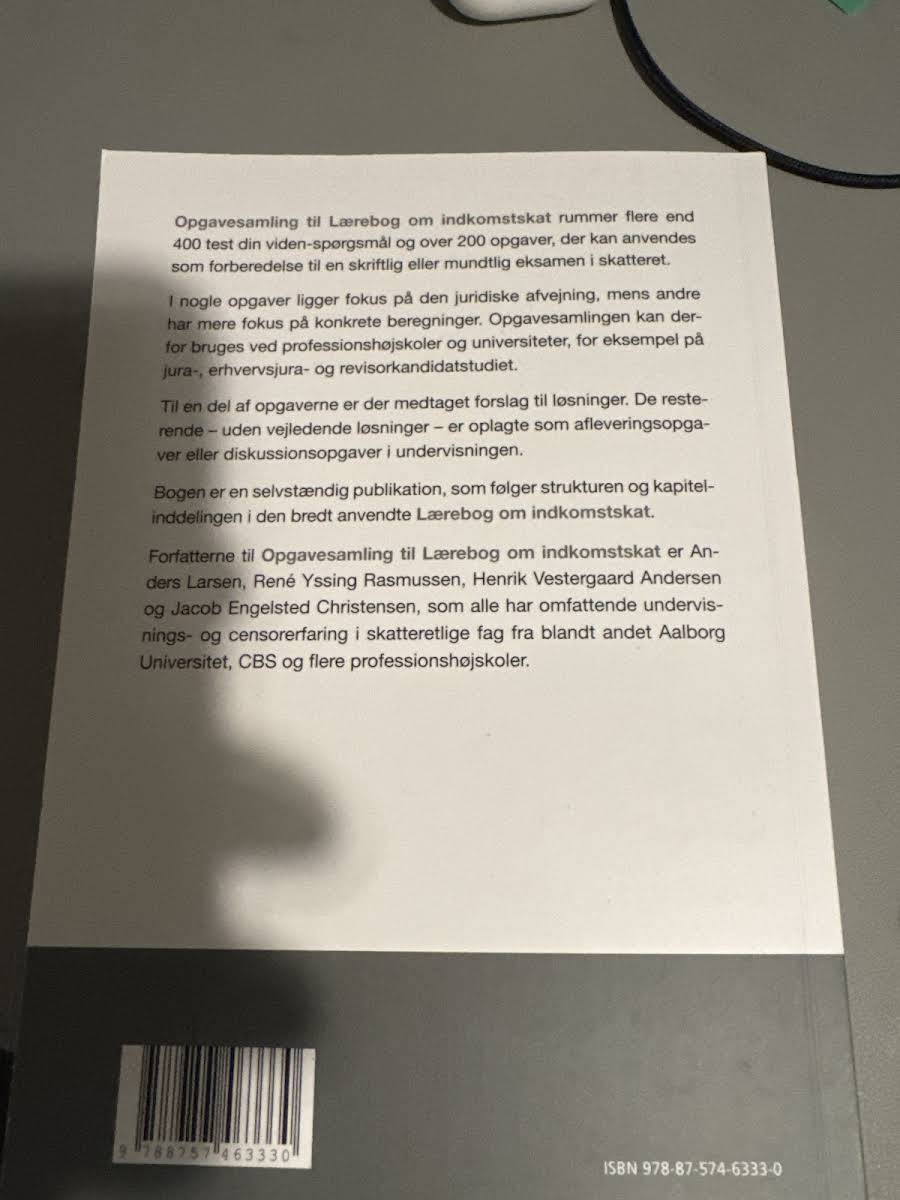 Opgavesamling til Lærebog om indkomstskat, 2. udgave (2025), indeholder over 400 "test din viden"-spørgsmål og mere end 200 konkrete opgaver, der er designet til at styrke din eksamensforberedelse i skatteret. Nogle opgaver lægger vægt på den juridiske vurdering af komplekse skattemæssige problemstillinger, mens andre fokuserer på detaljerede beregninger og talbehandling. Bogen henvender sig til studerende på professionshøjskoler og universiteter, særligt inden for jura-, erhvervsjura- og revisorkandidatstudier. En række af opgaverne leveres med vejledende løsningsforslag, så du kan kontrollere din tilgang og dine resultater. De resterende opgaver uden facit er velegnede som afleveringsopgaver eller som grundlag for faglige diskussioner i undervisningen. Som selvstændig publikation følger denne opgavesamling nøje strukturen og kapitelinddelingen i den bredt anvendte Lærebog om indkomstskat, hvilket gør den let at integrere i undervisningsforløb. Forfatterne Anders Larsen, René Yssing Rasmussen, Henrik Vestergaard Andersen og Jacob Engelsted Christensen bidrager alle med omfattende undervisnings- og censorerfaring fra blandt andet Aalborg Universitet, CBS og flere professionshøjskoler.