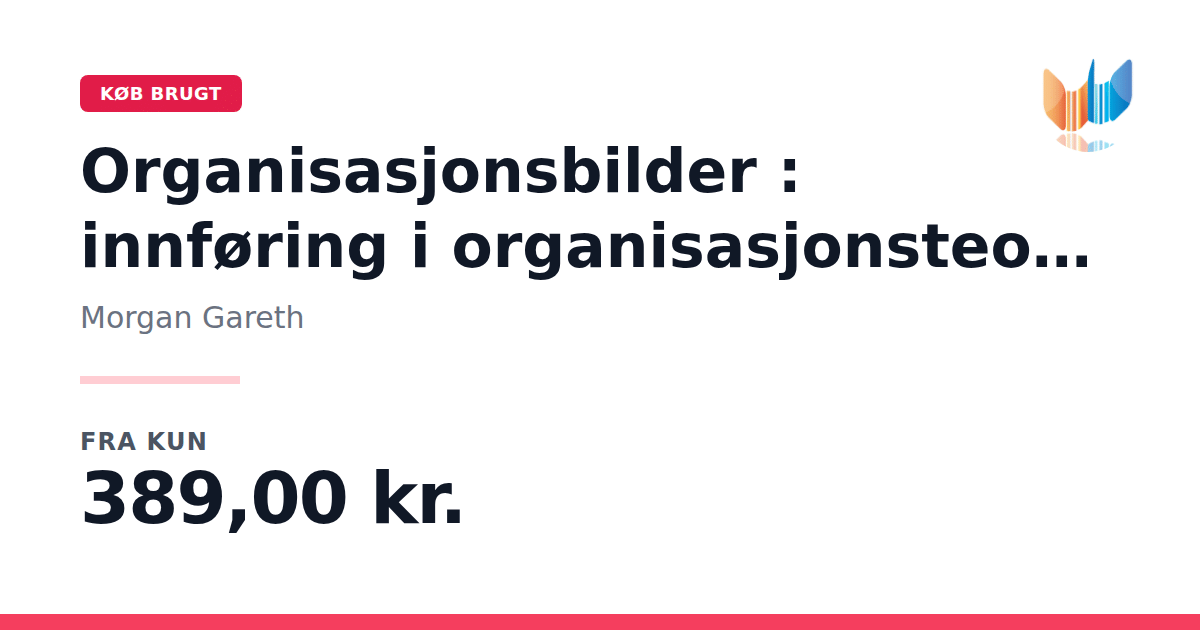 Lige nu kan du købe "Organisasjonsbilder : innføring i organisasjonsteori (2.utg.)" af Morgan Gareth til kun 389,00 kr. Du sparer hele 26% af nyprisen! Bogen du ser her er brugt, og i perfekt stand. Vi har i øjeblikket 2 eksemplarer til salg af "Organisasjonsbilder : innføring i organisasjonsteori (2.utg.)", så husk at se de forskellige udgaver.