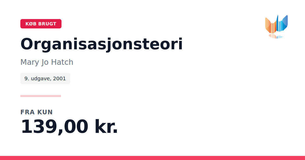 Lige nu kan du købe "Organisasjonsteori" af Mary Jo Hatch til kun 139,00 kr. Du sparer hele 68% af nyprisen! Bogen du ser her er brugt, og i perfekt stand. Vi har i øjeblikket 4 eksemplarer til salg af "Organisasjonsteori", så husk at se de forskellige udgaver.