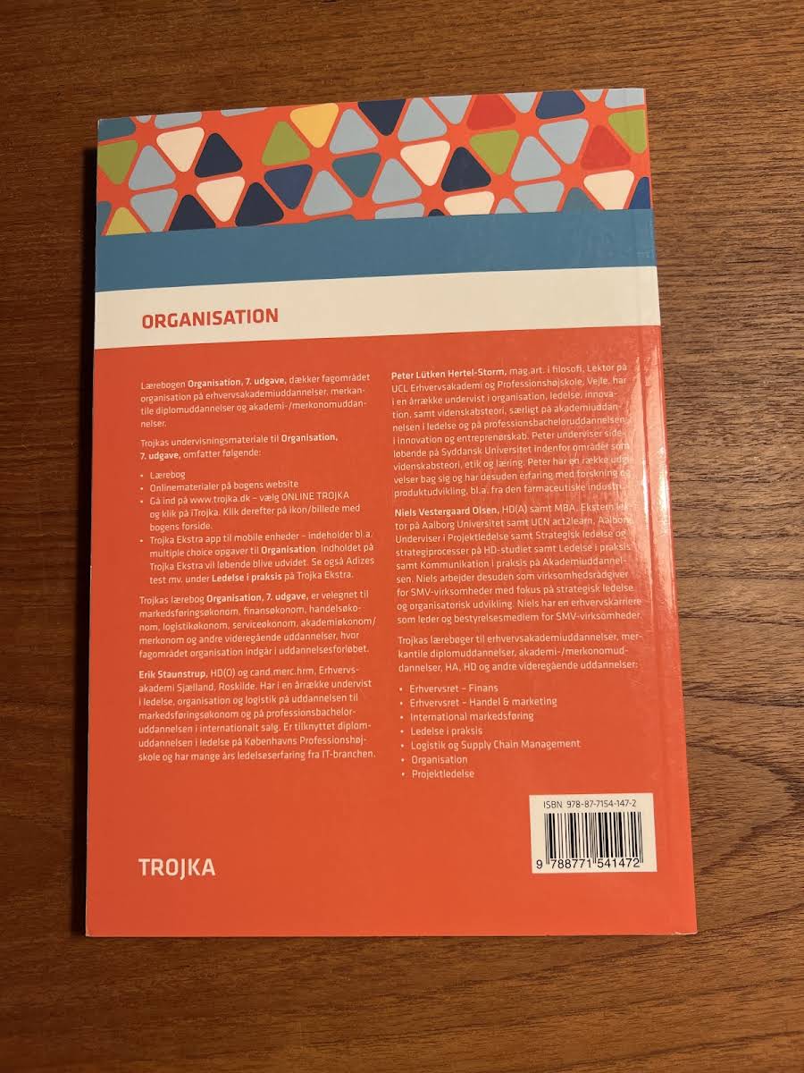 Organisation, 7. udgave, er en gennemarbejdet lærebog, der har markeret sig som en favorit på mange videregående uddannelser. Bogen imponerer med sin kombination af høj faglighed og en rigelig brug af illustrationer og figurer, som gør det nemt at få et overblik over de centrale teorier og modeller inden for organisationsfaget. I denne udgave er indholdet skærpet og fokus er lagt på de teoretiske kerneelementer, mens der er gjort plads til supplering med online materialer og andre undervisningsressourcer. Lærebogen formår at balancere mellem de klassiske organisatoriske tilgange og de nyeste tendenser, herunder inddragelsen af distance- og distribueret arbejde som svar på de moderne arbejdsformer. Yderligere er teamorganisering blevet uddybet med særligt fokus på fordele, udfordringer og betydningen af social kapital i forhold til teamdynamikker. Desuden præsenteres nye perspektiver på fremtidens organisationsformer med inspirerende metaforer som amøbe, fraktal og fiskenet, der sætter dagsordenen for emner som bæredygtighed og digital kommunikation. Med sin opdaterede tilgang og et reduceret omfang er denne 7. udgave et ideelt redskab til både undervisere og studerende, der ønsker et solidt teoretisk grundlag kombineret med moderne eksempler og digitale ressourcer.