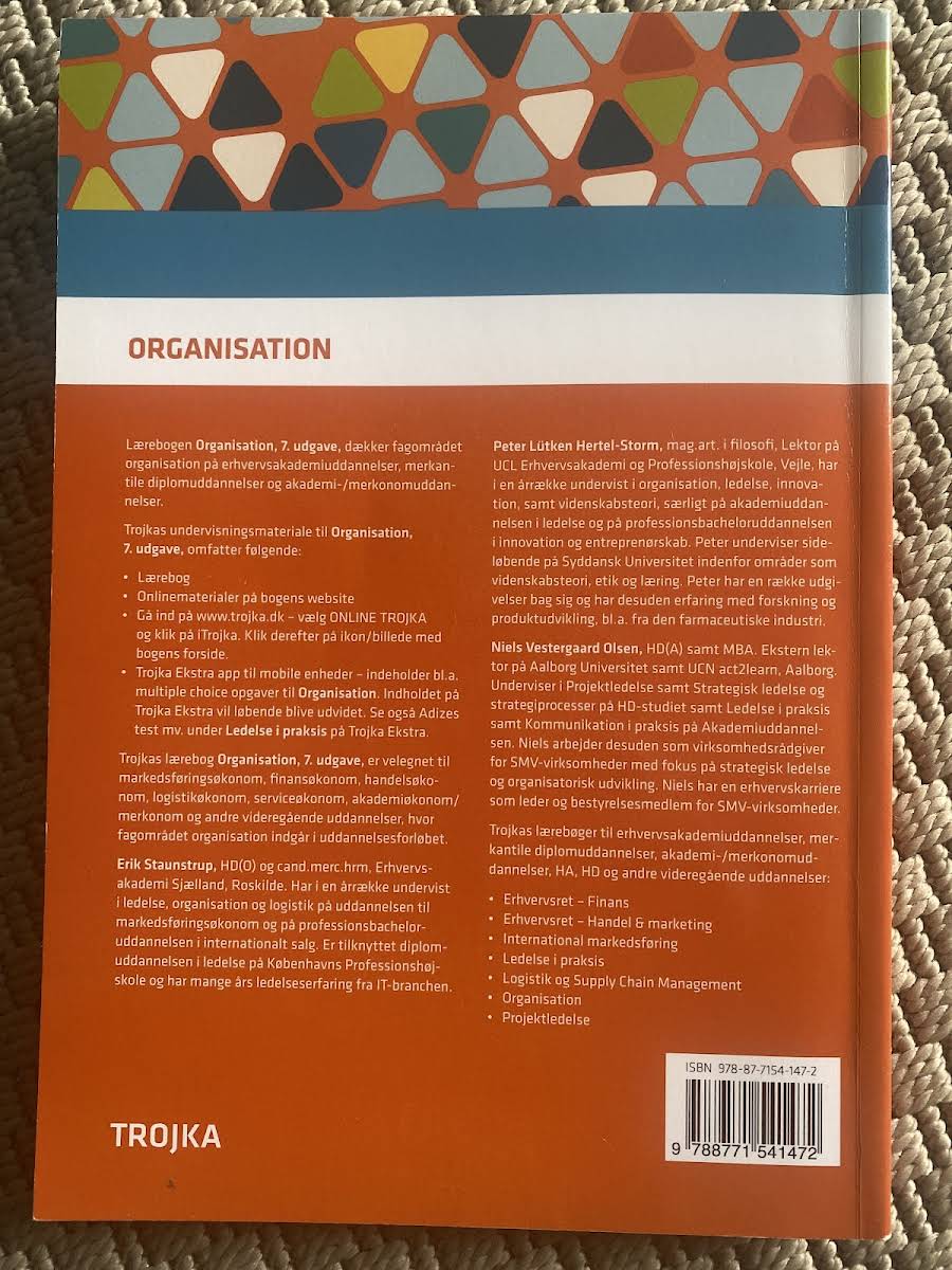 Organisation, 7. udgave, er en gennemarbejdet lærebog, der har markeret sig som en favorit på mange videregående uddannelser. Bogen imponerer med sin kombination af høj faglighed og en rigelig brug af illustrationer og figurer, som gør det nemt at få et overblik over de centrale teorier og modeller inden for organisationsfaget. I denne udgave er indholdet skærpet og fokus er lagt på de teoretiske kerneelementer, mens der er gjort plads til supplering med online materialer og andre undervisningsressourcer. Lærebogen formår at balancere mellem de klassiske organisatoriske tilgange og de nyeste tendenser, herunder inddragelsen af distance- og distribueret arbejde som svar på de moderne arbejdsformer. Yderligere er teamorganisering blevet uddybet med særligt fokus på fordele, udfordringer og betydningen af social kapital i forhold til teamdynamikker. Desuden præsenteres nye perspektiver på fremtidens organisationsformer med inspirerende metaforer som amøbe, fraktal og fiskenet, der sætter dagsordenen for emner som bæredygtighed og digital kommunikation. Med sin opdaterede tilgang og et reduceret omfang er denne 7. udgave et ideelt redskab til både undervisere og studerende, der ønsker et solidt teoretisk grundlag kombineret med moderne eksempler og digitale ressourcer.