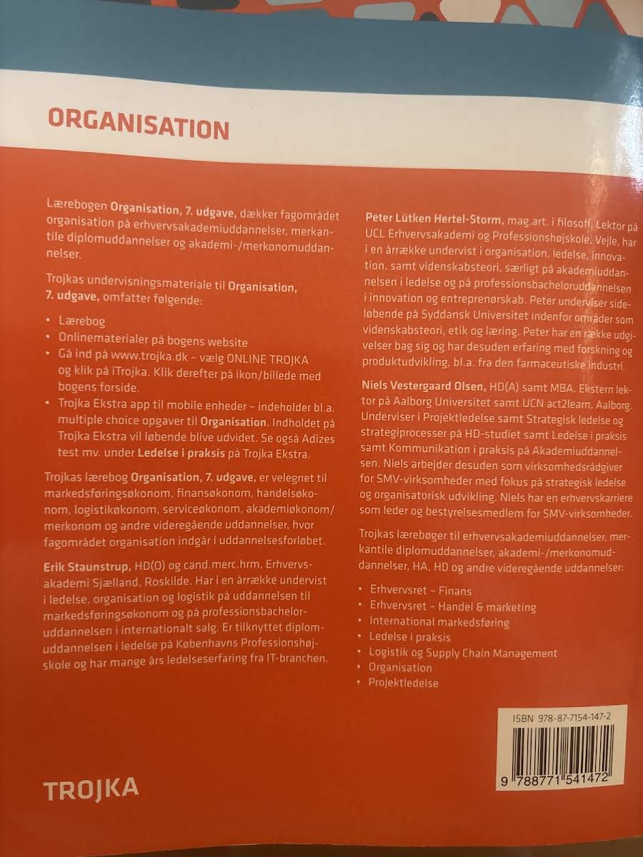 Organisation, 7. udgave, er en gennemarbejdet lærebog, der har markeret sig som en favorit på mange videregående uddannelser. Bogen imponerer med sin kombination af høj faglighed og en rigelig brug af illustrationer og figurer, som gør det nemt at få et overblik over de centrale teorier og modeller inden for organisationsfaget. I denne udgave er indholdet skærpet og fokus er lagt på de teoretiske kerneelementer, mens der er gjort plads til supplering med online materialer og andre undervisningsressourcer. Lærebogen formår at balancere mellem de klassiske organisatoriske tilgange og de nyeste tendenser, herunder inddragelsen af distance- og distribueret arbejde som svar på de moderne arbejdsformer. Yderligere er teamorganisering blevet uddybet med særligt fokus på fordele, udfordringer og betydningen af social kapital i forhold til teamdynamikker. Desuden præsenteres nye perspektiver på fremtidens organisationsformer med inspirerende metaforer som amøbe, fraktal og fiskenet, der sætter dagsordenen for emner som bæredygtighed og digital kommunikation. Med sin opdaterede tilgang og et reduceret omfang er denne 7. udgave et ideelt redskab til både undervisere og studerende, der ønsker et solidt teoretisk grundlag kombineret med moderne eksempler og digitale ressourcer.