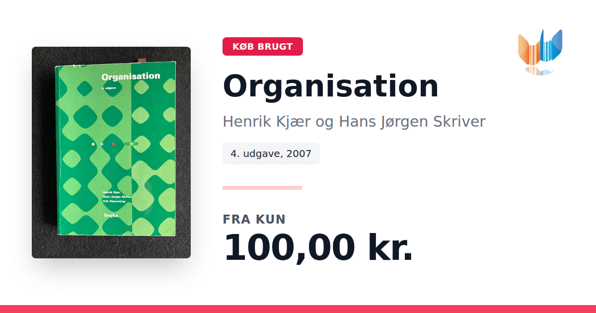 Lige nu kan du købe "Organisation" af Henrik Kjær og Hans Jørgen Skriver til kun 100,00 kr. Bogen du ser her er brugt, og i god stand. Vi har i øjeblikket 17 eksemplarer til salg af "Organisation", så husk at se de forskellige udgaver.