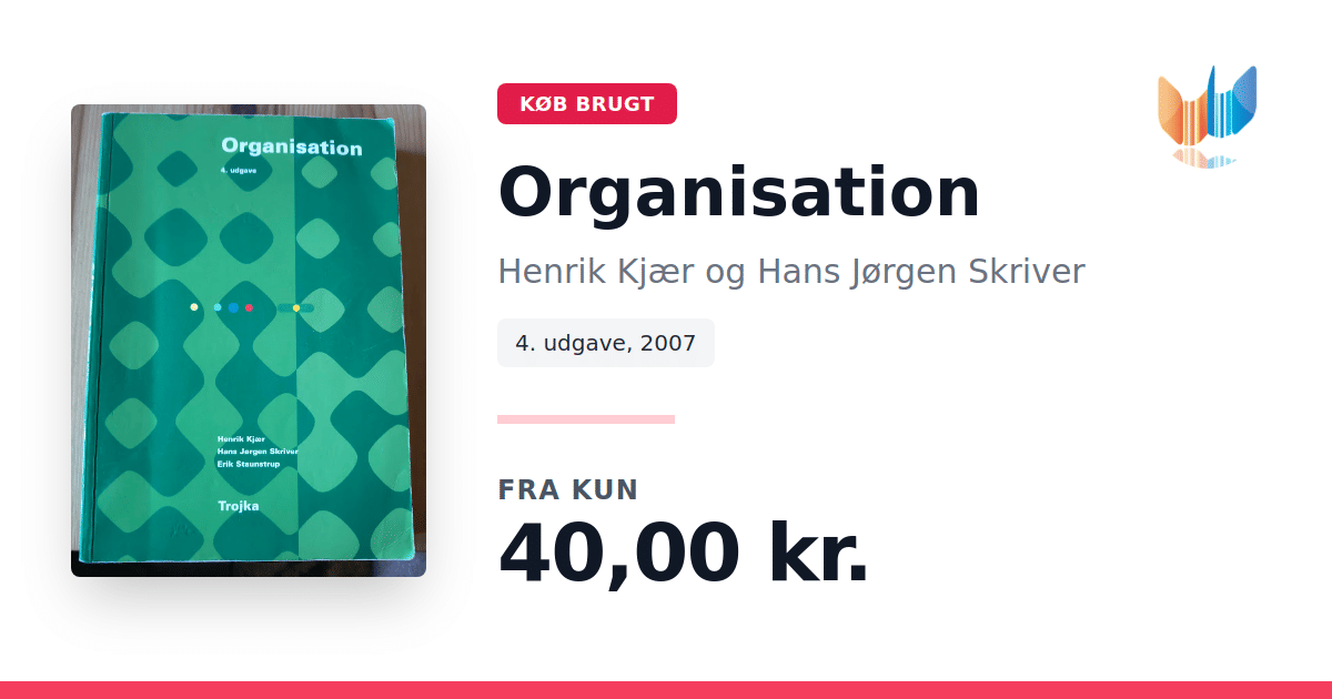 Lige nu kan du købe "Organisation" af Henrik Kjær og Hans Jørgen Skriver til kun 40,00 kr. Bogen du ser her er brugt, og i god stand. Vi har i øjeblikket 18 eksemplarer til salg af "Organisation", så husk at se de forskellige udgaver.