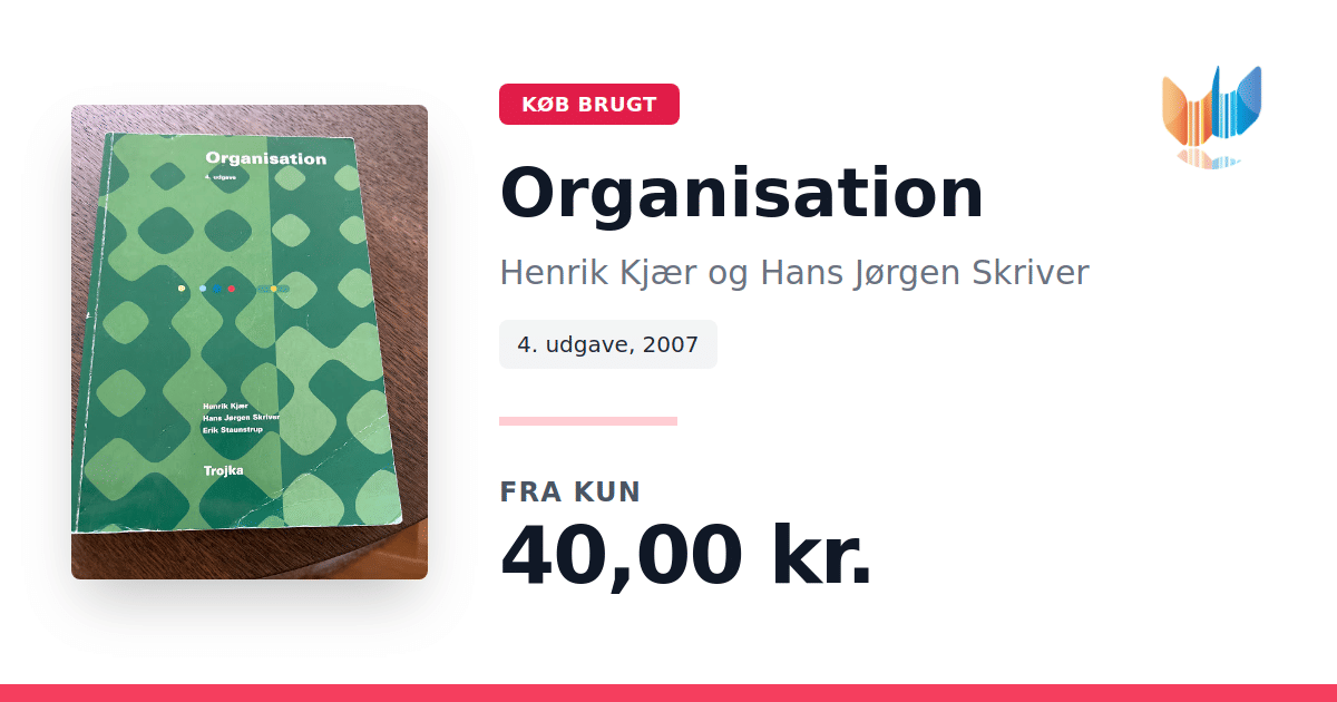 Lige nu kan du købe "Organisation" af Henrik Kjær og Hans Jørgen Skriver til kun 40,00 kr. Bogen du ser her er brugt, og i god stand. Vi har i øjeblikket 19 eksemplarer til salg af "Organisation", så husk at se de forskellige udgaver.
