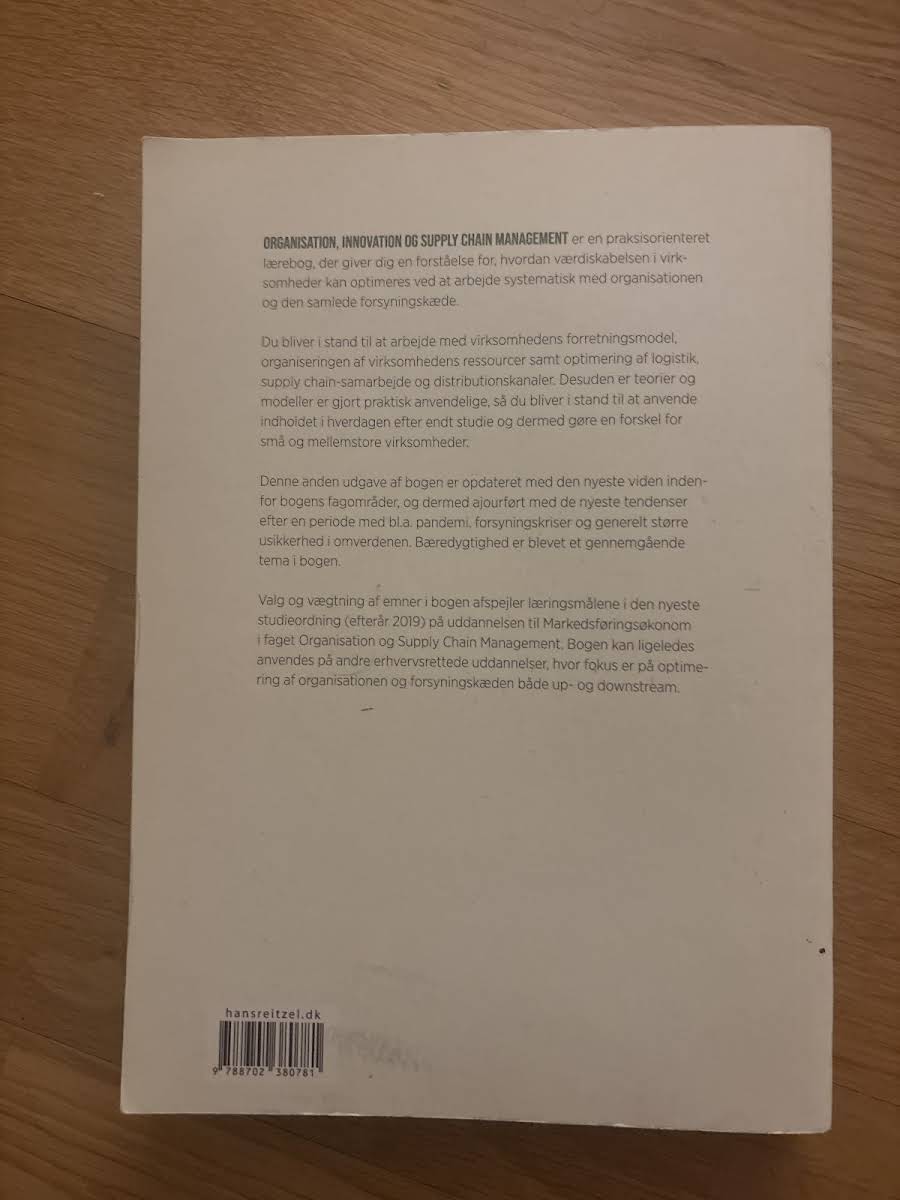 "Organisation, innovation og supply chain management" er en praksisnær lærebog, der giver indblik i, hvordan virksomheder kan øge deres værdiskabelse gennem en systematisk tilgang til både organisationen og forsyningskæden. Bogen guider læseren i arbejdet med forretningsmodellen, ressourceorganisering samt optimering af logistik, samarbejde i supply chain og distributionskanaler. Med et solidt fundament i teorier og modeller, som er gjort praktisk anvendelige, gør bogen det muligt for studerende at omsætte akademisk viden til konkrete løsninger i hverdagen, særligt for små og mellemstore virksomheder. De første kapitler udfordrer læseren til at arbejde innovativt med forretningsmodellen, mens efterfølgende kapitler fokuserer på projektstyring, ledelse, teamsamarbejde og de menneskelige ressourcer i organisationen. Videre dykker bogen ned i, hvordan en struktureret organisation og en stærk virksomhedskultur kan understøtte værdiskabelsen. Der sættes også fokus på det personlige lederskab og vigtigheden af at lede sig selv, inden man kan lede andre. Endvidere behandles centrale aspekter af logistik, samarbejde i forsyningskæden og den strategiske opbygning af distributionskanaler – fra design til den praktiske optimering i den enkelte salgskanal. Skrevet af Dorthe Bohlbro, Thomas Lindholm Uth, Anne Sejer Hansen, Jes Victor Noldus Christiansen og Anne Boeg, og udgivet af Hans Reitzels Forlag i 2023, er denne 480-siders paperback et vigtigt redskab for alle, der ønsker at styrke forståelsen af, hvordan organisation og supply chain management hænger sammen og kan skabe vækst.