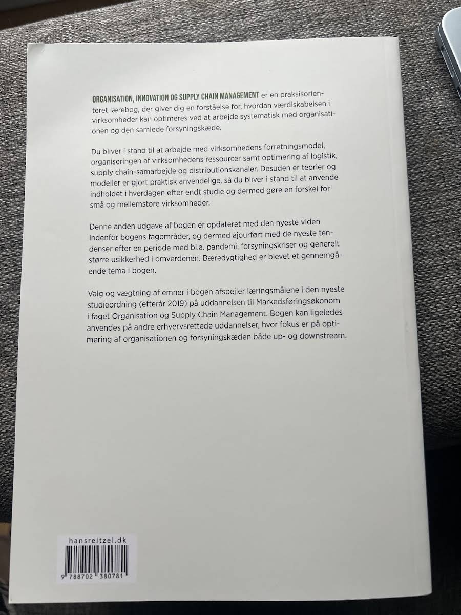 "Organisation, innovation og supply chain management" er en praksisnær lærebog, der giver indblik i, hvordan virksomheder kan øge deres værdiskabelse gennem en systematisk tilgang til både organisationen og forsyningskæden. Bogen guider læseren i arbejdet med forretningsmodellen, ressourceorganisering samt optimering af logistik, samarbejde i supply chain og distributionskanaler. Med et solidt fundament i teorier og modeller, som er gjort praktisk anvendelige, gør bogen det muligt for studerende at omsætte akademisk viden til konkrete løsninger i hverdagen, særligt for små og mellemstore virksomheder. De første kapitler udfordrer læseren til at arbejde innovativt med forretningsmodellen, mens efterfølgende kapitler fokuserer på projektstyring, ledelse, teamsamarbejde og de menneskelige ressourcer i organisationen. Videre dykker bogen ned i, hvordan en struktureret organisation og en stærk virksomhedskultur kan understøtte værdiskabelsen. Der sættes også fokus på det personlige lederskab og vigtigheden af at lede sig selv, inden man kan lede andre. Endvidere behandles centrale aspekter af logistik, samarbejde i forsyningskæden og den strategiske opbygning af distributionskanaler – fra design til den praktiske optimering i den enkelte salgskanal. Skrevet af Dorthe Bohlbro, Thomas Lindholm Uth, Anne Sejer Hansen, Jes Victor Noldus Christiansen og Anne Boeg, og udgivet af Hans Reitzels Forlag i 2023, er denne 480-siders paperback et vigtigt redskab for alle, der ønsker at styrke forståelsen af, hvordan organisation og supply chain management hænger sammen og kan skabe vækst.