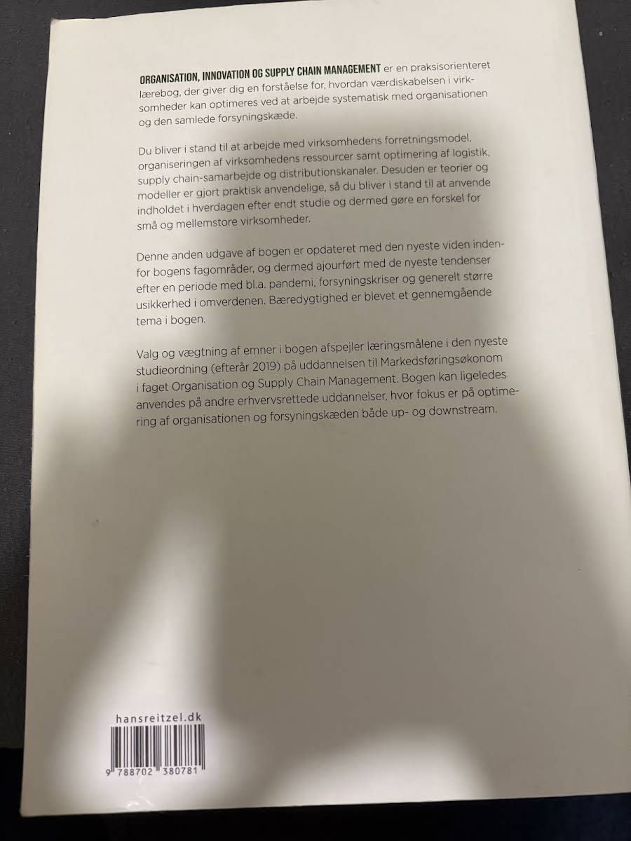 "Organisation, innovation og supply chain management" er en praksisnær lærebog, der giver indblik i, hvordan virksomheder kan øge deres værdiskabelse gennem en systematisk tilgang til både organisationen og forsyningskæden. Bogen guider læseren i arbejdet med forretningsmodellen, ressourceorganisering samt optimering af logistik, samarbejde i supply chain og distributionskanaler. Med et solidt fundament i teorier og modeller, som er gjort praktisk anvendelige, gør bogen det muligt for studerende at omsætte akademisk viden til konkrete løsninger i hverdagen, særligt for små og mellemstore virksomheder. De første kapitler udfordrer læseren til at arbejde innovativt med forretningsmodellen, mens efterfølgende kapitler fokuserer på projektstyring, ledelse, teamsamarbejde og de menneskelige ressourcer i organisationen. Videre dykker bogen ned i, hvordan en struktureret organisation og en stærk virksomhedskultur kan understøtte værdiskabelsen. Der sættes også fokus på det personlige lederskab og vigtigheden af at lede sig selv, inden man kan lede andre. Endvidere behandles centrale aspekter af logistik, samarbejde i forsyningskæden og den strategiske opbygning af distributionskanaler – fra design til den praktiske optimering i den enkelte salgskanal. Skrevet af Dorthe Bohlbro, Thomas Lindholm Uth, Anne Sejer Hansen, Jes Victor Noldus Christiansen og Anne Boeg, og udgivet af Hans Reitzels Forlag i 2023, er denne 480-siders paperback et vigtigt redskab for alle, der ønsker at styrke forståelsen af, hvordan organisation og supply chain management hænger sammen og kan skabe vækst.