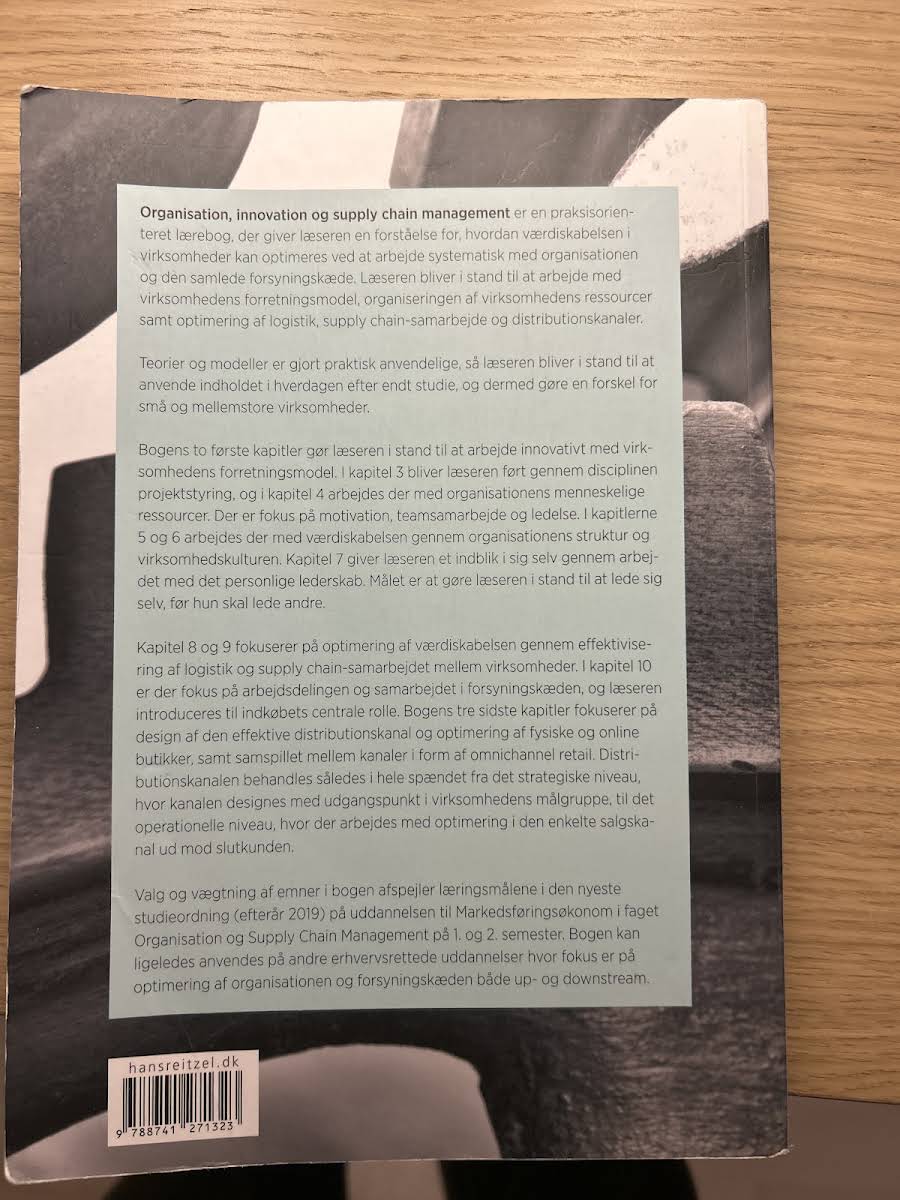 "Organisation, innovation og supply chain management" er en praksisorienteret lærebog, der belyser, hvordan man systematisk kan optimere værdiskabelsen i virksomheder. Bogen introducerer læseren til centrale metoder for at udvikle en konkurrencedygtig forretningsmodel og forbedre samspillet mellem organisationens ressourcer og eksterne processer. Gennem et struktureret kapitelforløb får læseren indsigt i, hvordan innovation, projektstyring og ledelse kan integreres i både små og mellemstore virksomheders drift. Fokus er også rettet mod, hvordan samarbejde, teams og medarbejdermotivation bidrager til en styrket organisationskultur og forbedret supply chain. De afsnit, der behandler logistik, indkøb og design af distributionskanaler, viser, hvordan teorier og modeller omsættes til konkrete værktøjer i den daglige praksis. Denne balance mellem teori og praksis gør bogen til et værdifuldt redskab for studerende og fagfolk med interesse for organisation og forsyningskæde. Med udgangspunkt i de nyeste undervisningsmål giver bogen et solidt fundament for at forstå og optimere den komplekse integration af interne og eksterne virksomhedsfunktioner.