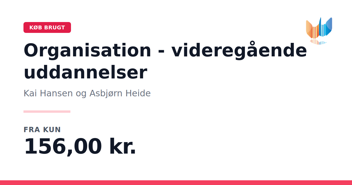 Lige nu kan du købe "Organisation - videregående uddannelser" af Kai Hansen og Asbjørn Heide til kun 156,00 kr. Bogen du ser her er brugt, og i perfekt stand. Vi har i øjeblikket kun et enkelt eksemplar til salg af "Organisation - videregående uddannelser", så slå til mens du kan!