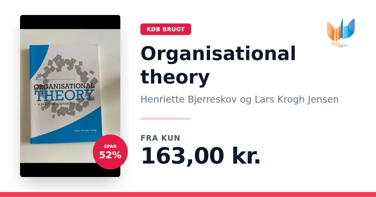 Lige nu kan du købe "Organisational theory" af Henriette Bjerreskov og Lars Krogh Jensen til kun 163,00 kr. Du sparer hele 52% af nyprisen! Bogen du ser her er brugt, og i god stand. Vi har i øjeblikket 5 eksemplarer til salg af "Organisational theory", så husk at se de forskellige udgaver.