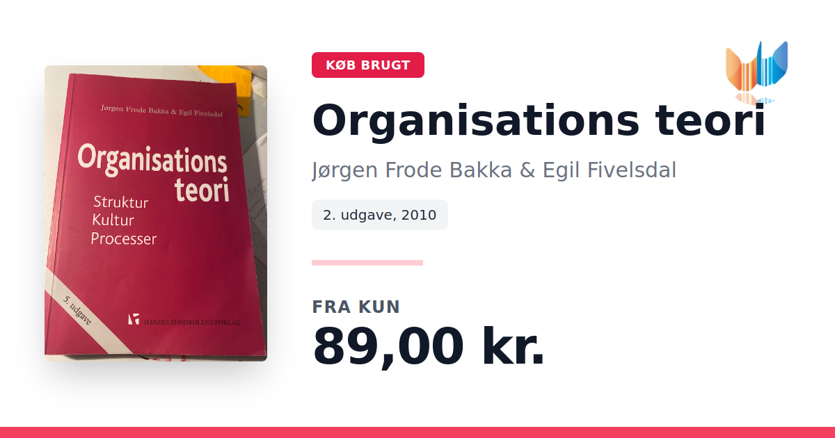 Organisationsteori: Struktur, Kultur, Processer af Jørgen Frode Bakka (2010) giver et systematisk overblik over de teorier og begreber, der former måden, vi forstår og organiserer arbejde på i både private og offentlige organisationer. Bogen henvender sig til studerende og ledere, der ønsker at kombinere teoretisk indsigt med konkrete eksempler fra praksis. Ud fra tre analytiske vinkler - strukturperspektivet, kulturperspektivet og procesperspektivet - belyses organisationers opbygning, deres værdier og symbolske univers samt de dynamikker, der knytter sig til beslutninger, motivation og forandring. Strukturperspektivet kortlægger både formelle roller og informelle netværk. Kulturperspektivet viser, hvordan normer og historier skaber sammenhængskraft. Procesperspektivet sætter fokus på strategiske valg, usikkerhedshåndtering og implementering af nye initiativer. I bogen præsenteres en række illustrative cases fra danske organisationer: Gamle Carlsberg, Falcks Redningskorps, Coloplast, IKEA, IRMA, Oticon, Amager Hospital, Hørsholm Kommune og andre. Hver case udfolder, hvordan teorierne anvendes i praksis, og skaber en direkte kobling mellem akademisk forskning og daglig ledelse. Organisationsteori er dermed både en grundbog og et inspirationskatalog for alle, der ønsker at forstå og udvikle organisationer.